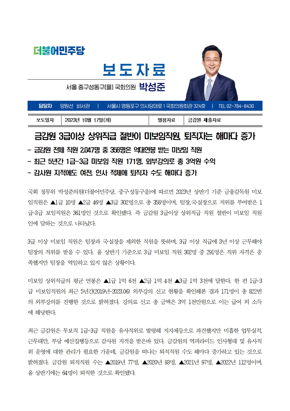 [국회의원 박성준_보도자료]231017_금감원 3급이상 상위직급 절반이 미보임직원 퇴직자는 해마다 증가.hwp