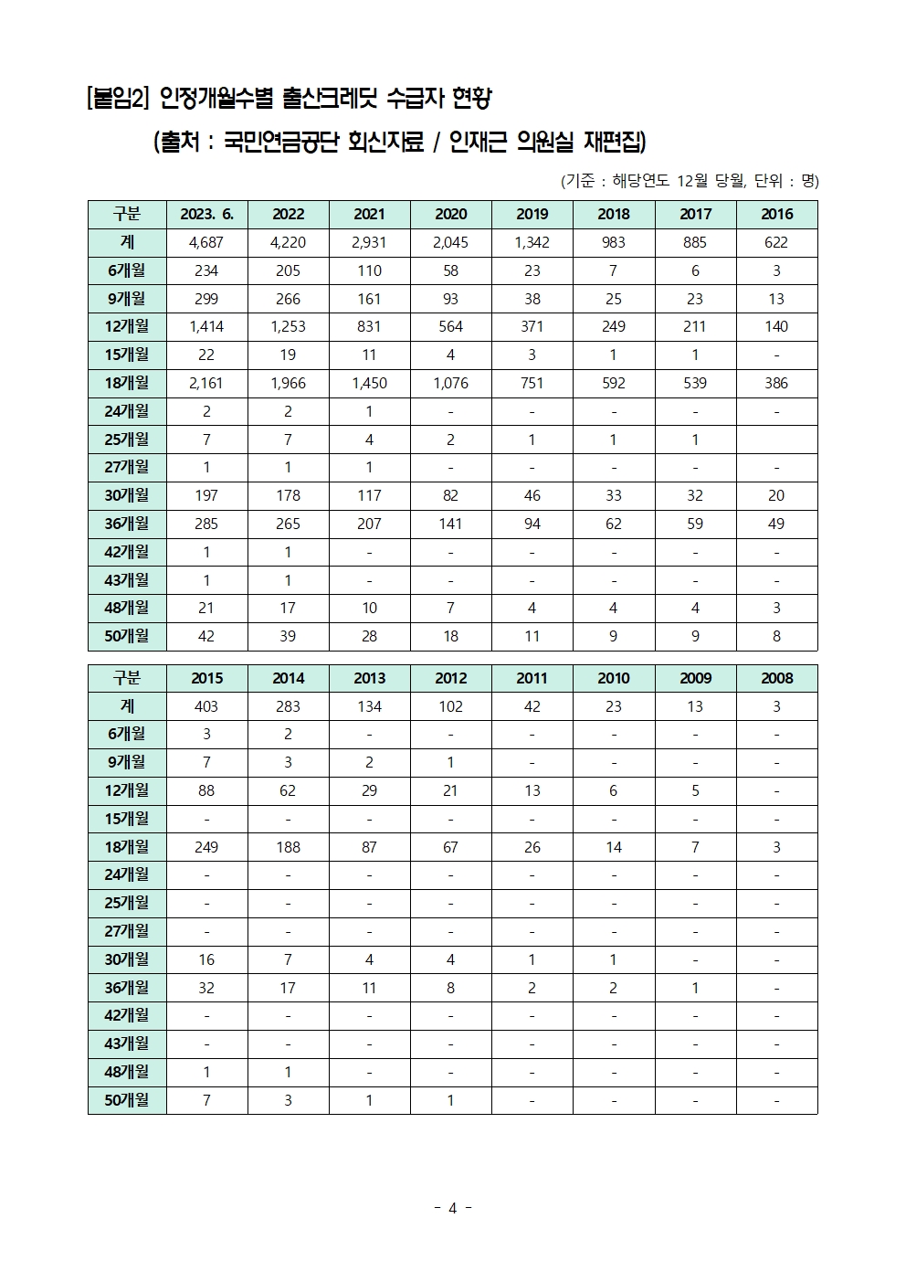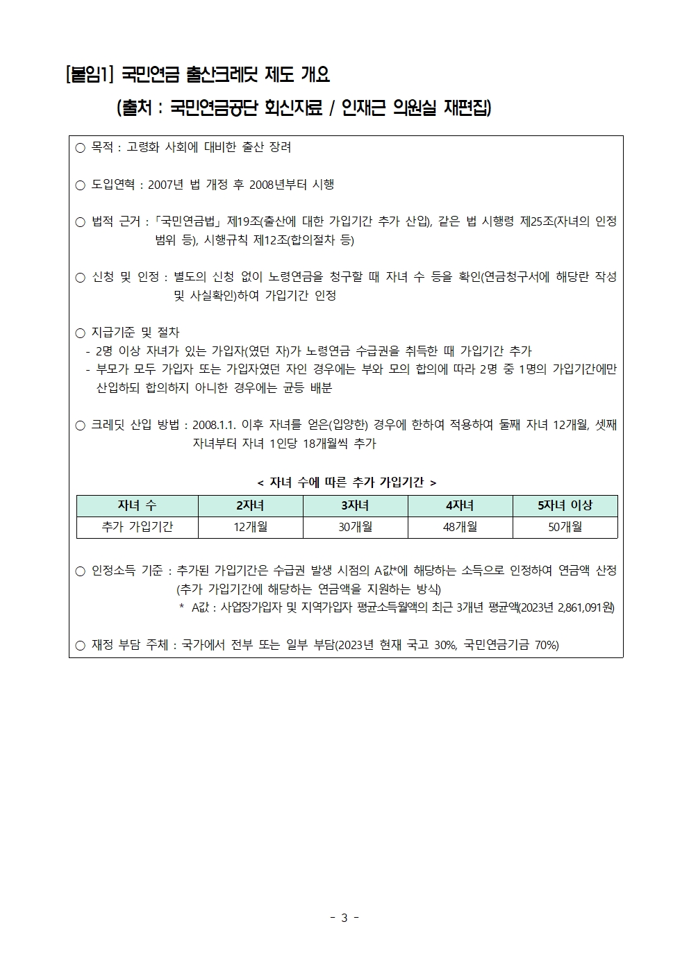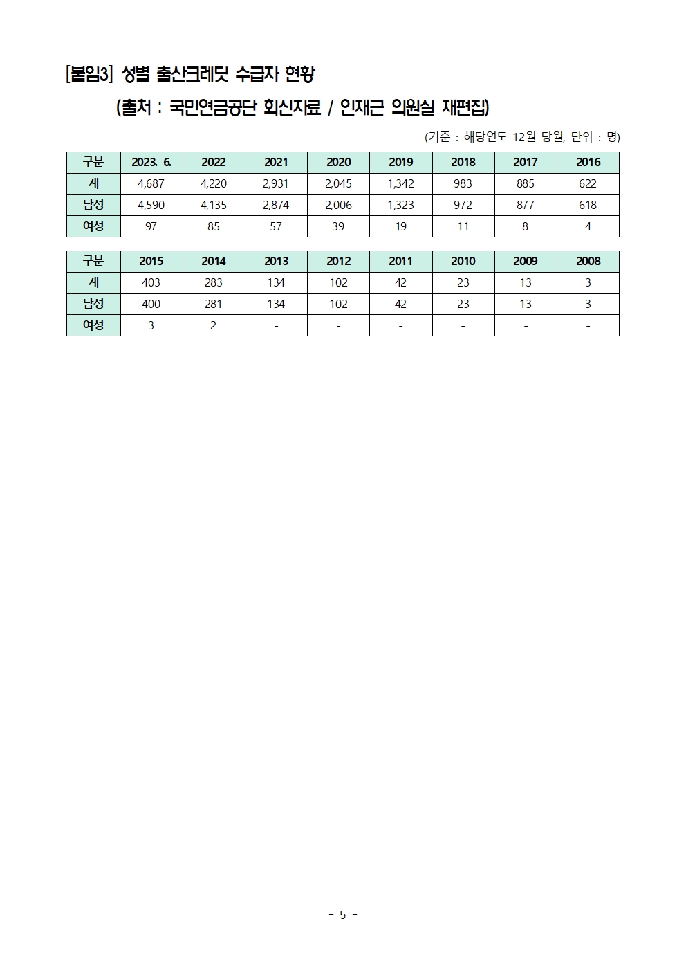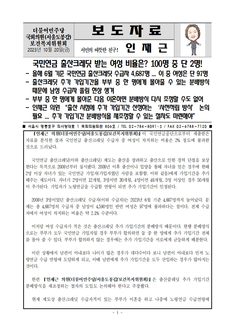 [인재근의원실 보도자료] 국민연금 출산크레딧 받는 여성 비율은? 100명 중 단 2명!