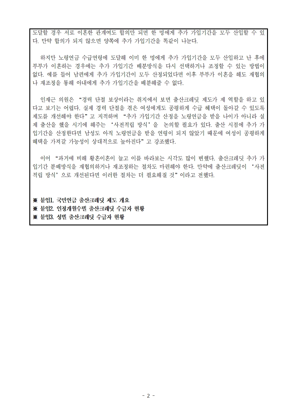 231020_[인재근의원실 보도자료] 국민연금 출산크레딧 받는 여성 비율은 100명 중 단 2명.hwp