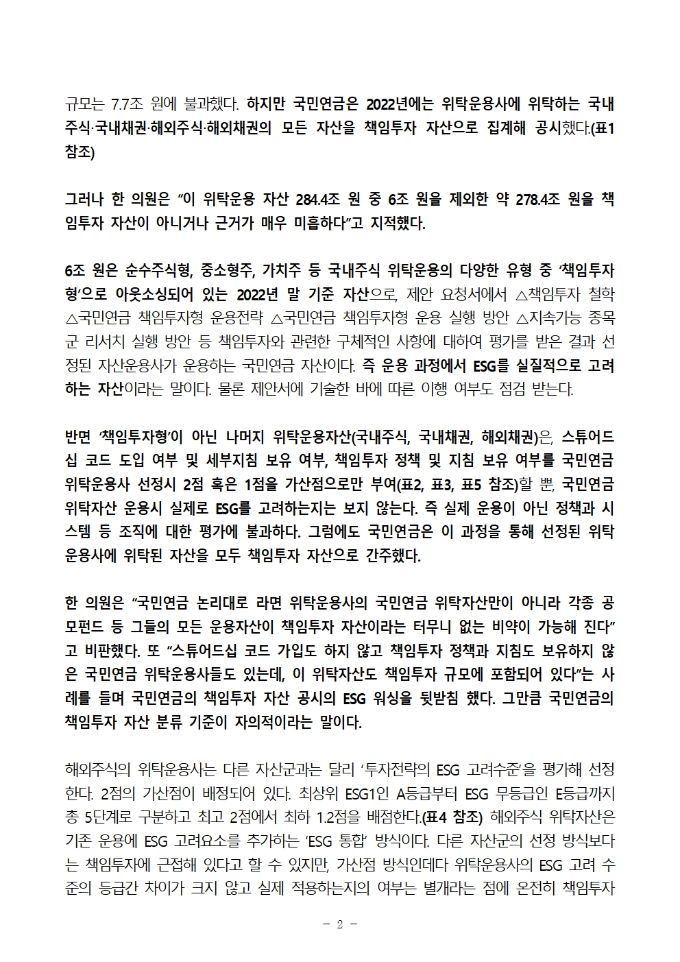 [한정애의원 보도자료] 국민연금 위탁운용 책임투자 자산 98%는 ESG 워싱