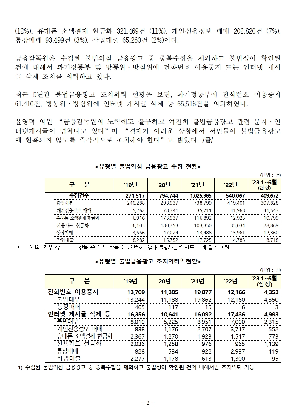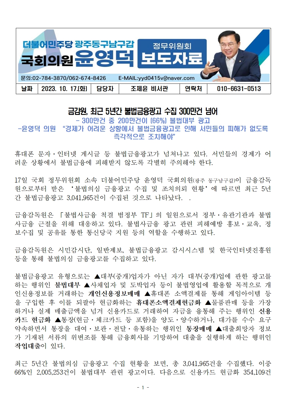 231017_윤영덕_보도자료_금감원_ 최근 5년간 불법금융광고 수집 300만건 넘어.hwp