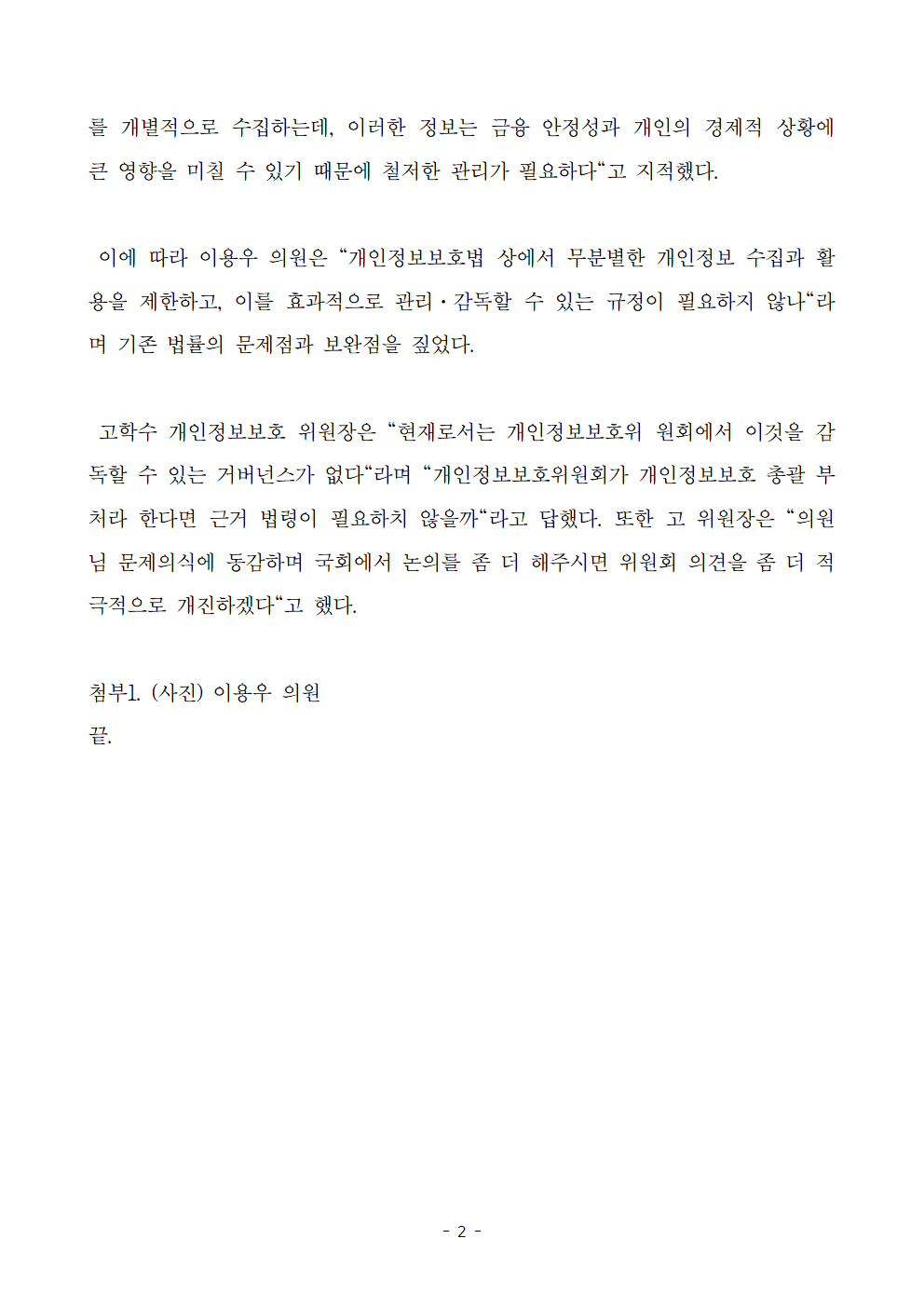 [이용우 의원] 이용우 의원, 핀테크·플랫폼 기업 개인 민감 정보 무단 활용 거버넌스 강화 필요 지적!