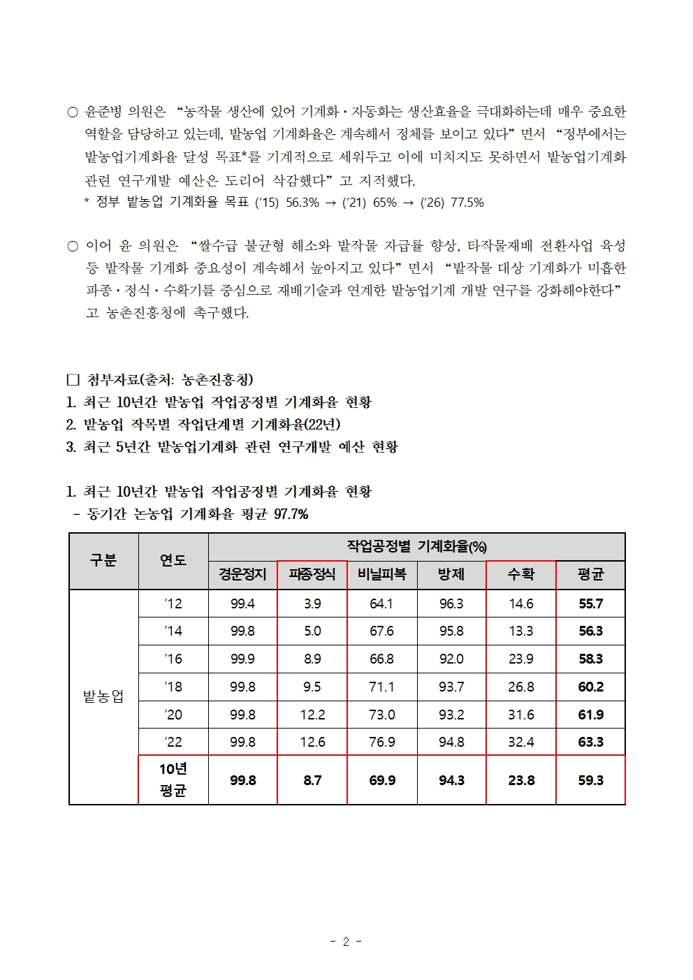231018 [윤준병 의원 국정감사 보도자료] 윤준병 의원 “밭농업 기계화율 60% 못미치는데 농촌진흥청 R&D 예산마저 20% 가까이 삭감!” (1).hwp