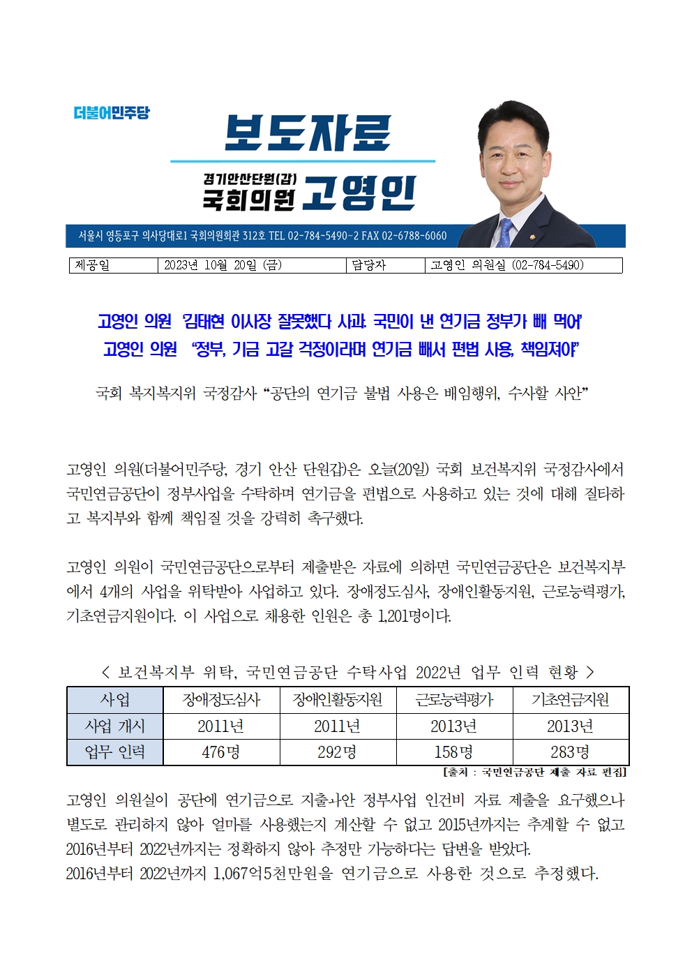 2023_1020_보도자료_고영인_의원_‘김태현_국민연금공단_이사장_잘못했다_사과_국민이_낸_연기금_정부가_빼_먹어’.hwp
