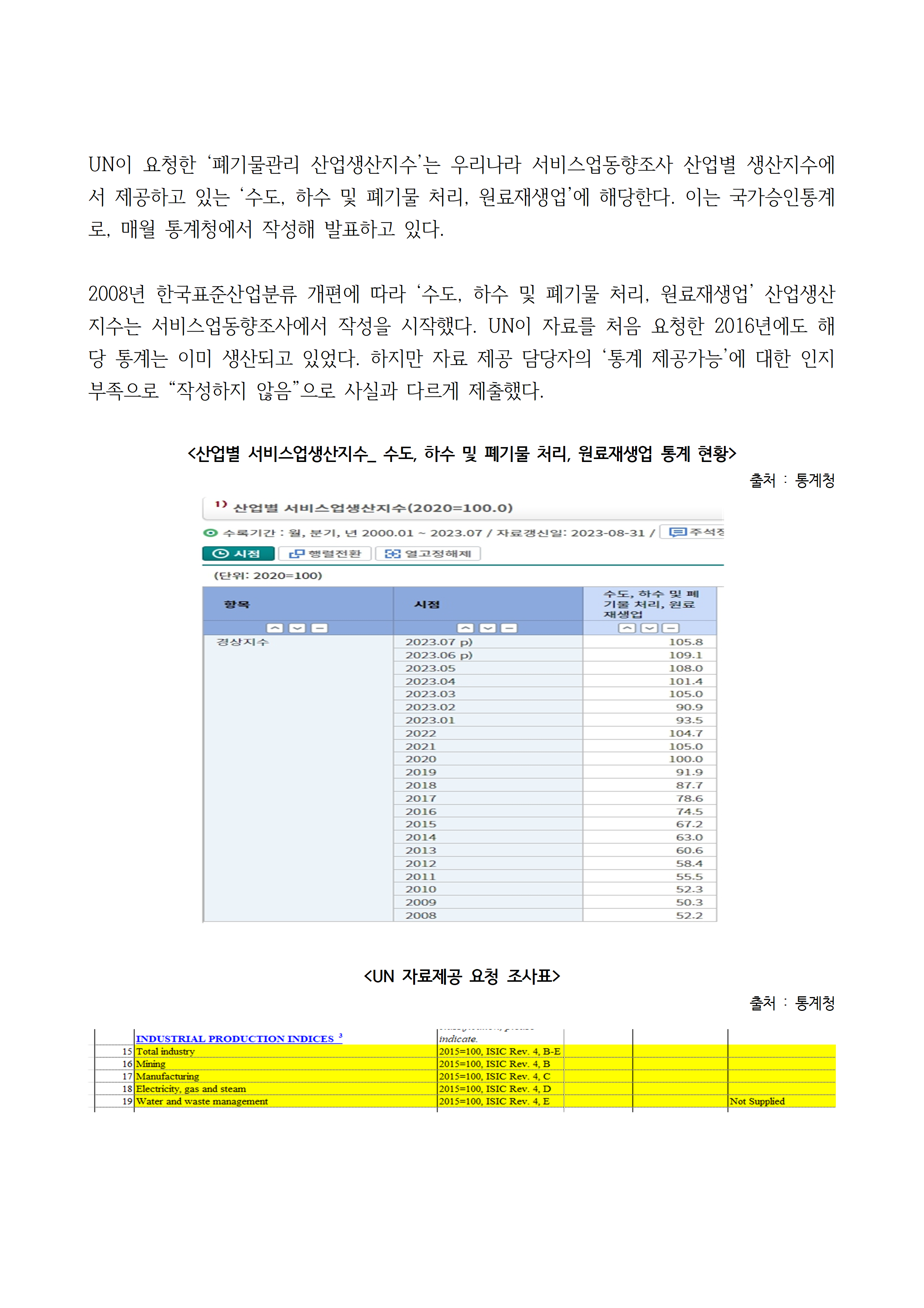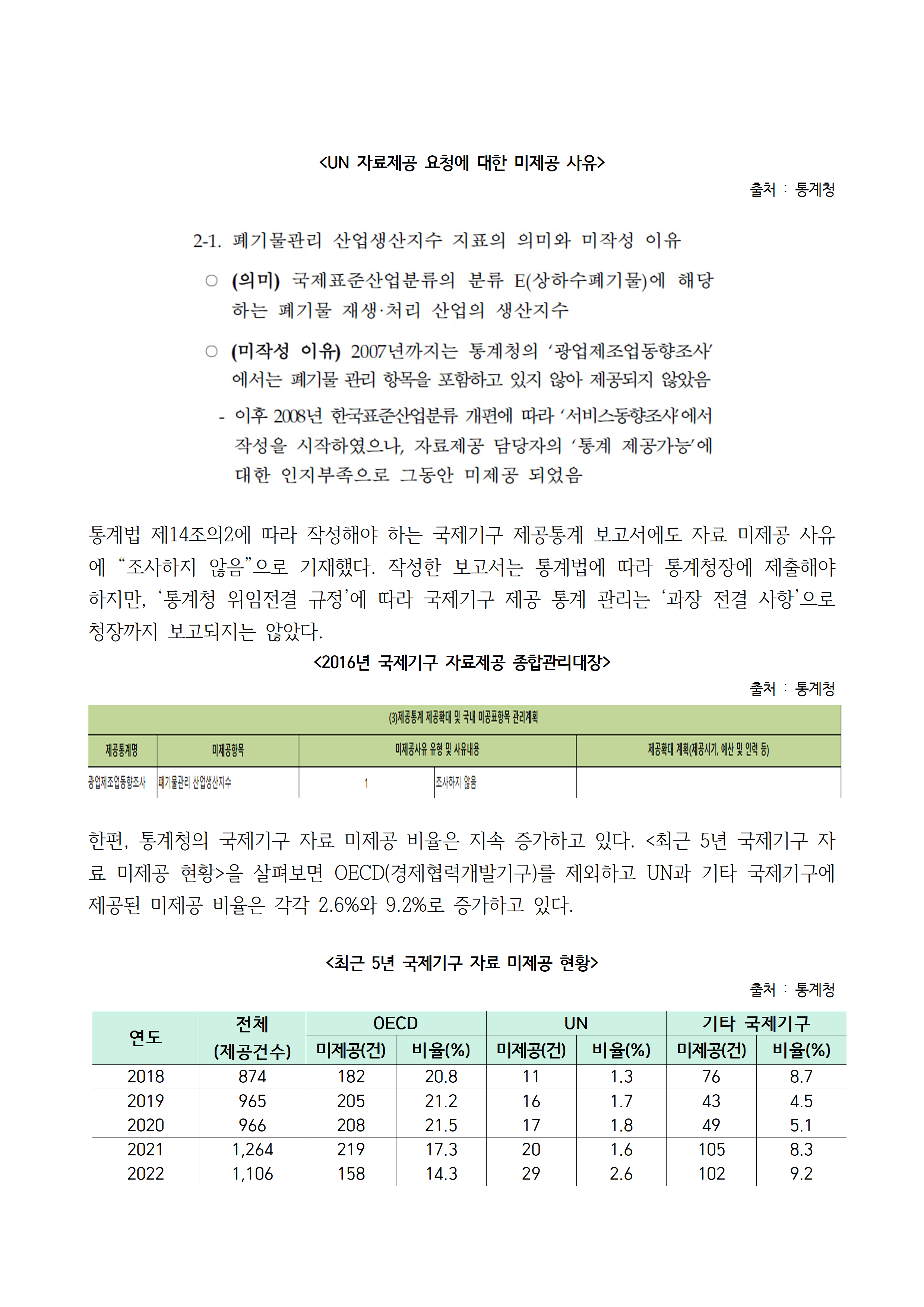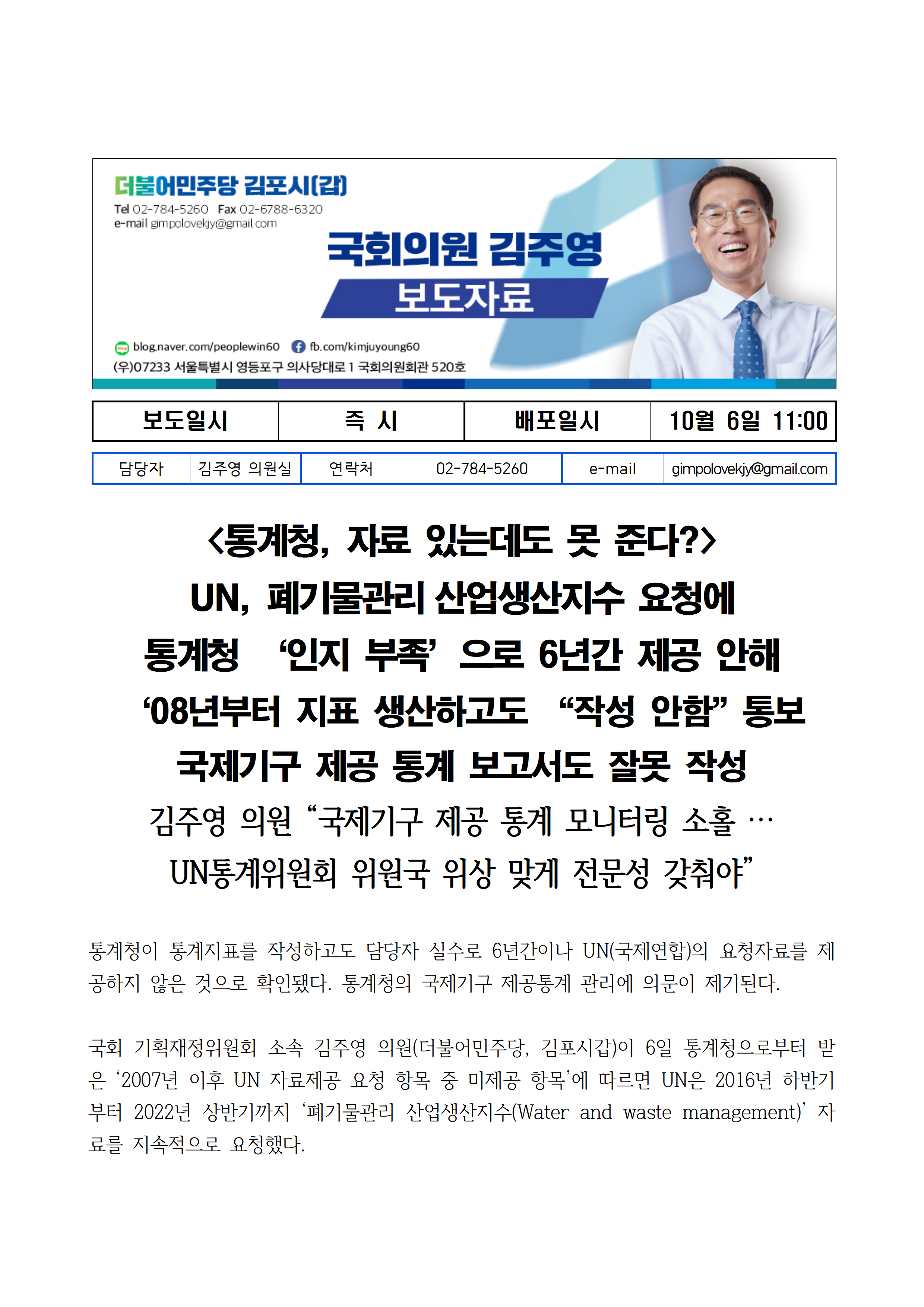[김주영 의원 국감보도자료] <통계청, 자료 있는데도 못 준다?> UN, 폐기물관리 산업생산지수 요청에 통계청 ‘인지 부족’으로 6년간 제공 안해
