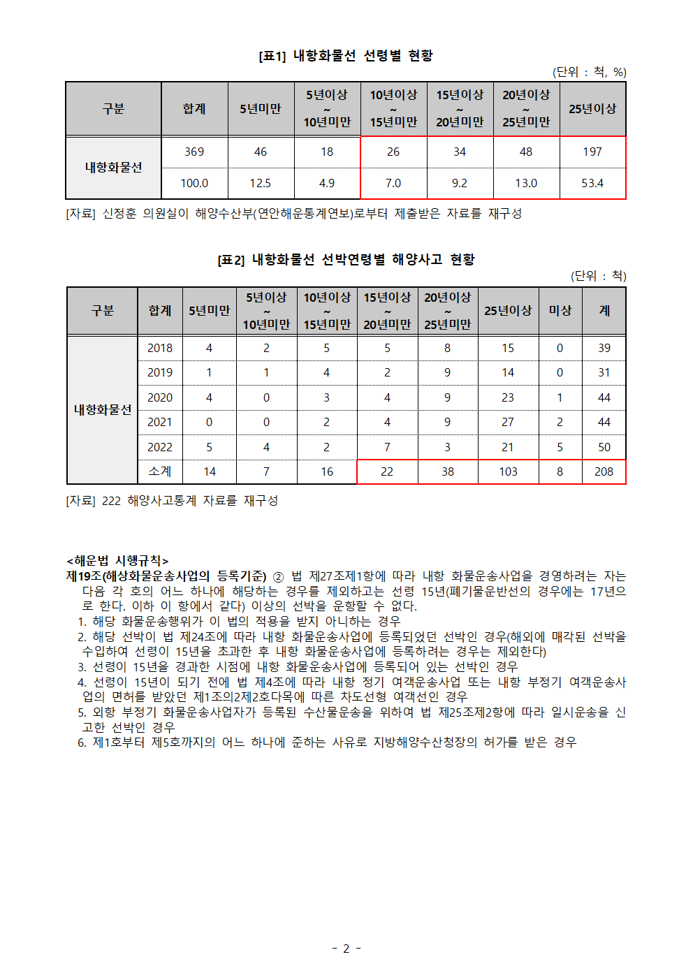 [신정훈 의원 보도자료] 내항화물선 노후화 심각... 4척 중 3척은 15년 이상 노후 선박