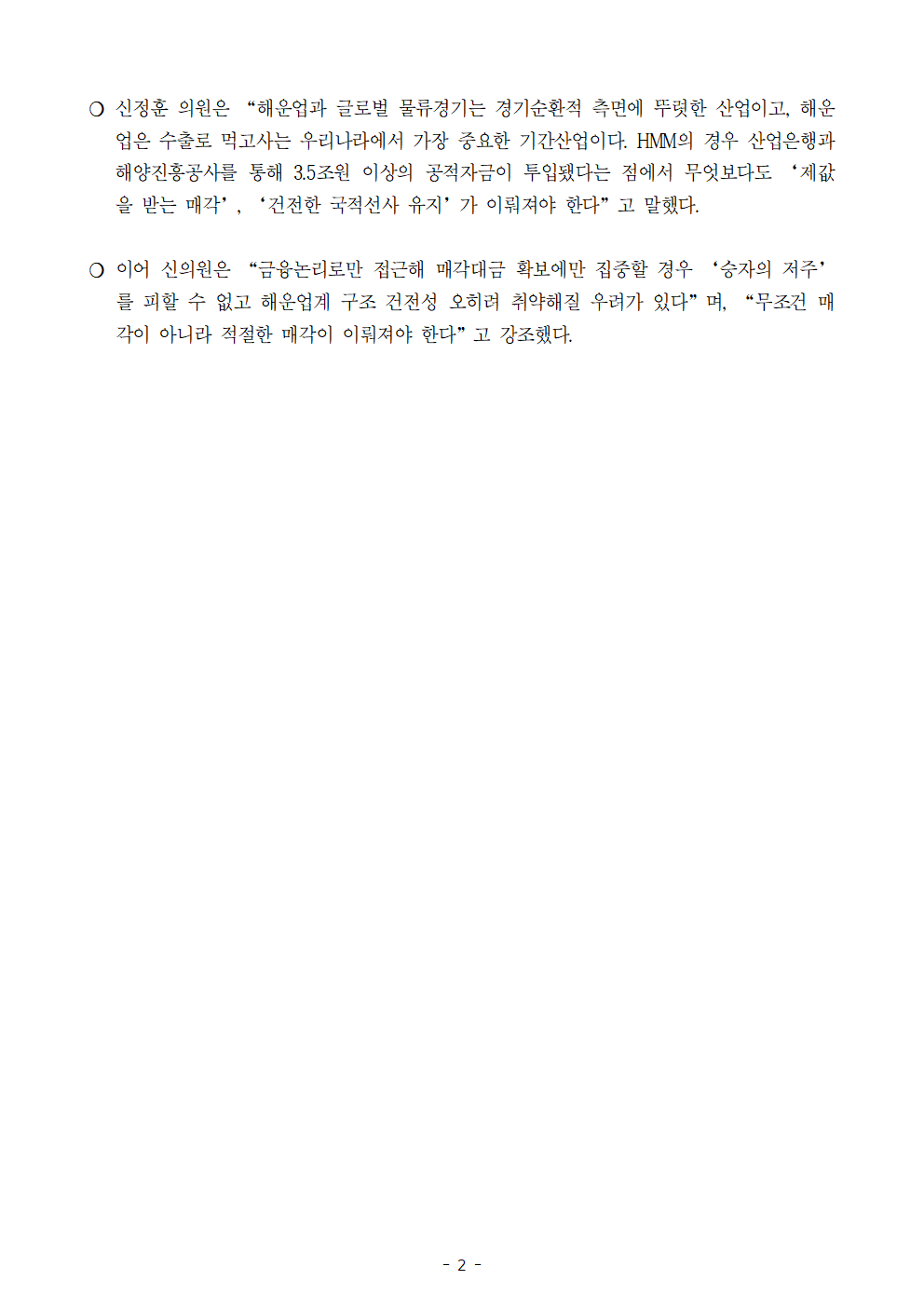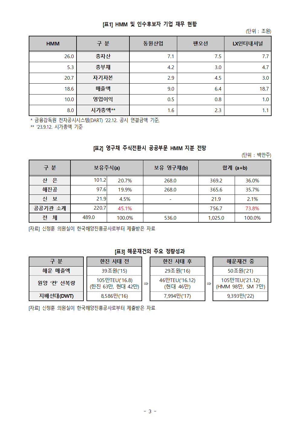[신정훈 의원 보도자료] HMM 인수후보 3사 ‘총자산’ HMM의 1/3 수준 밑돌아