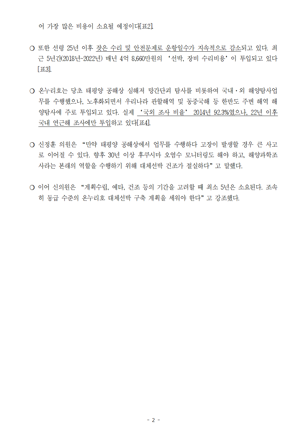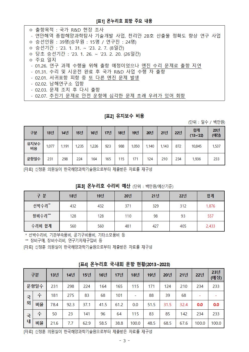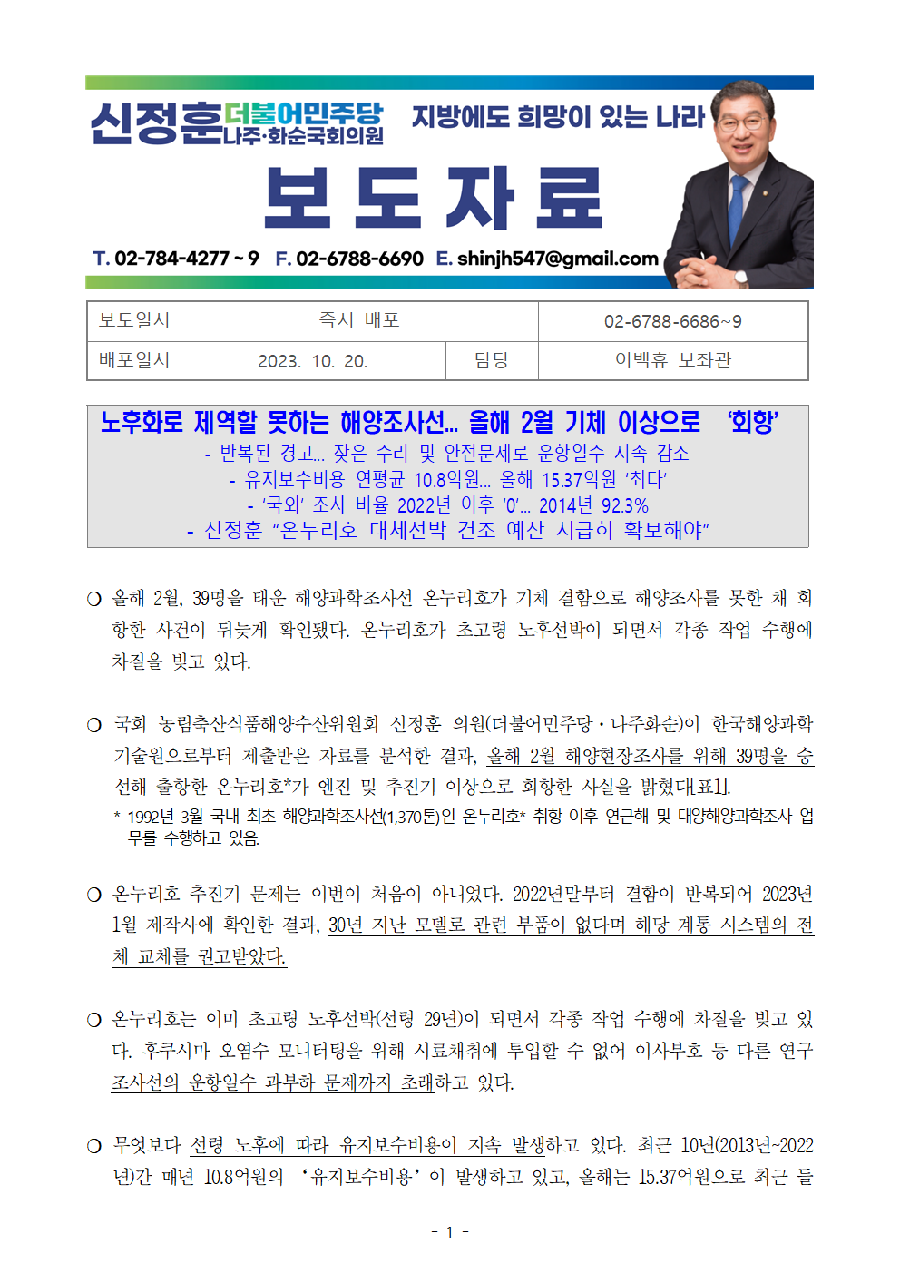 [신정훈 의원 보도자료] 노후화로 제역할 못하는 해양조사선... 올해 2월 기체 이상으로 ‘회항’