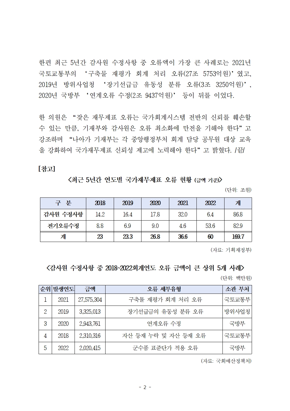[한병도의원]2023기재위국정감사보도자료(1)_지난 5년간 오류액만 170조원 국가재무제표 신뢰 훼손 우려돼.hwp