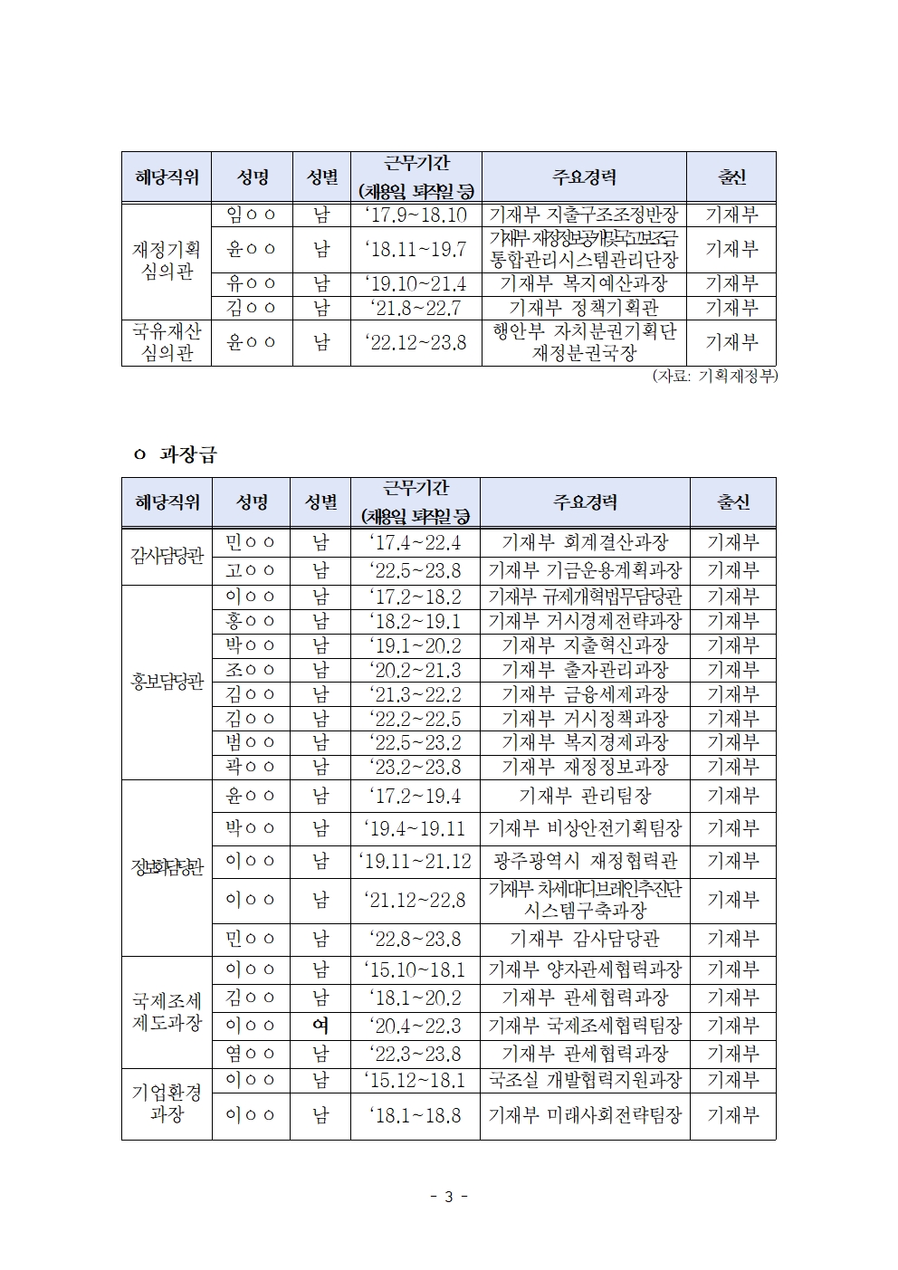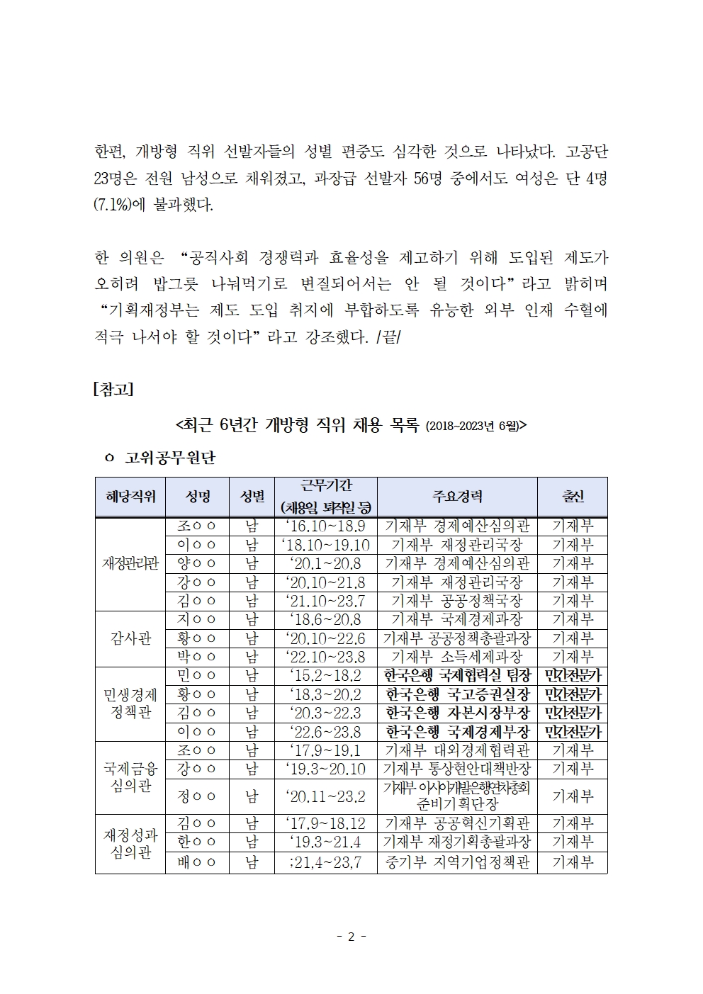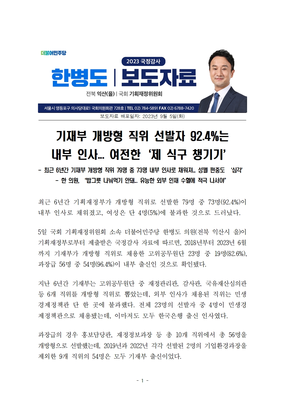 [한병도의원]2023기재위국정감사보도자료(4)_기재부 개방형직위 선발자 92.4퍼센트는 내부 인사... 여전한 ‘제 식구 챙기기’.hwp
