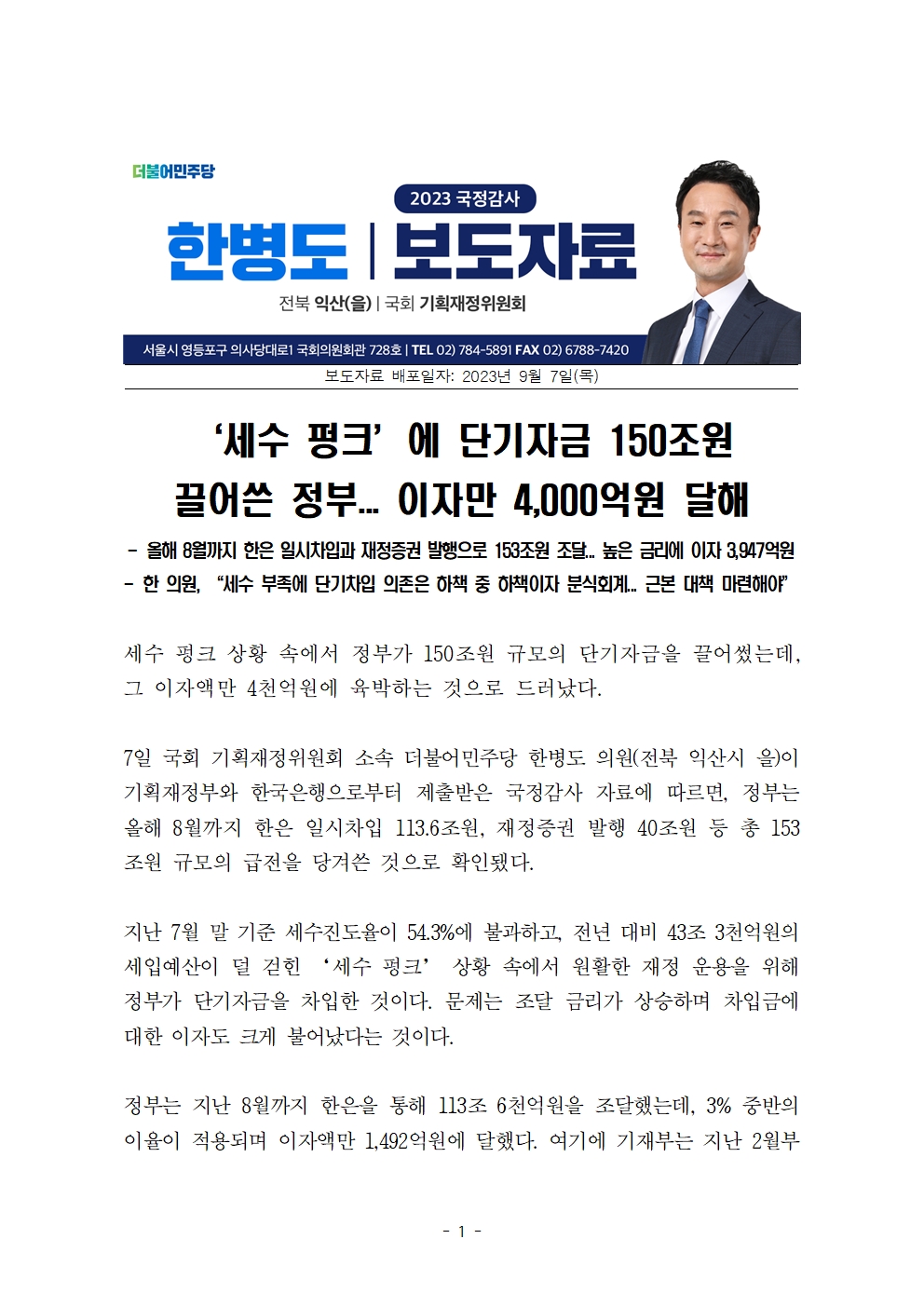 [국회의원 한병도 국감 보도자료] ‘세수 펑크’에 단기자금 150조원 끌어쓴 정부... 이자만 4,000억원 육박