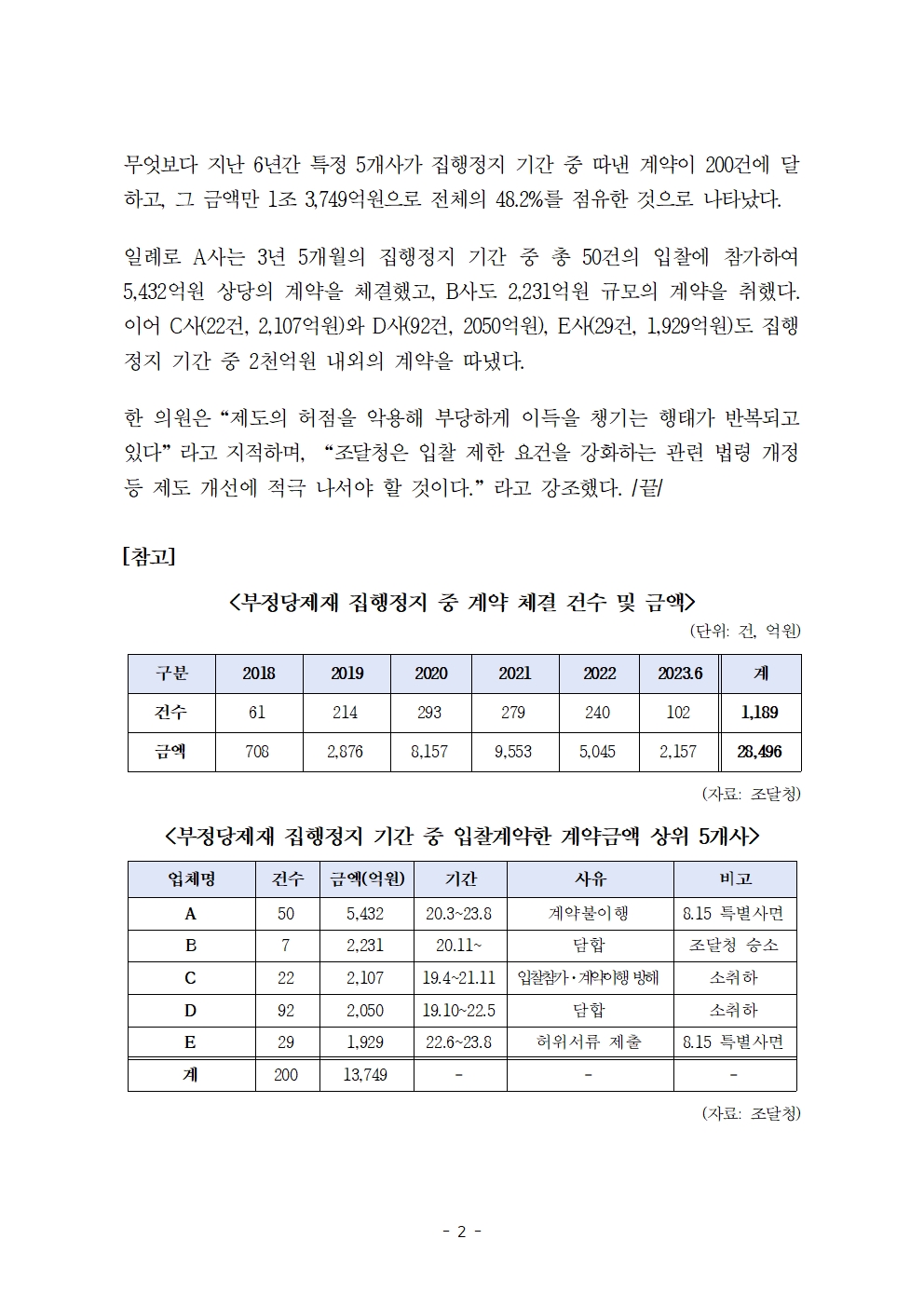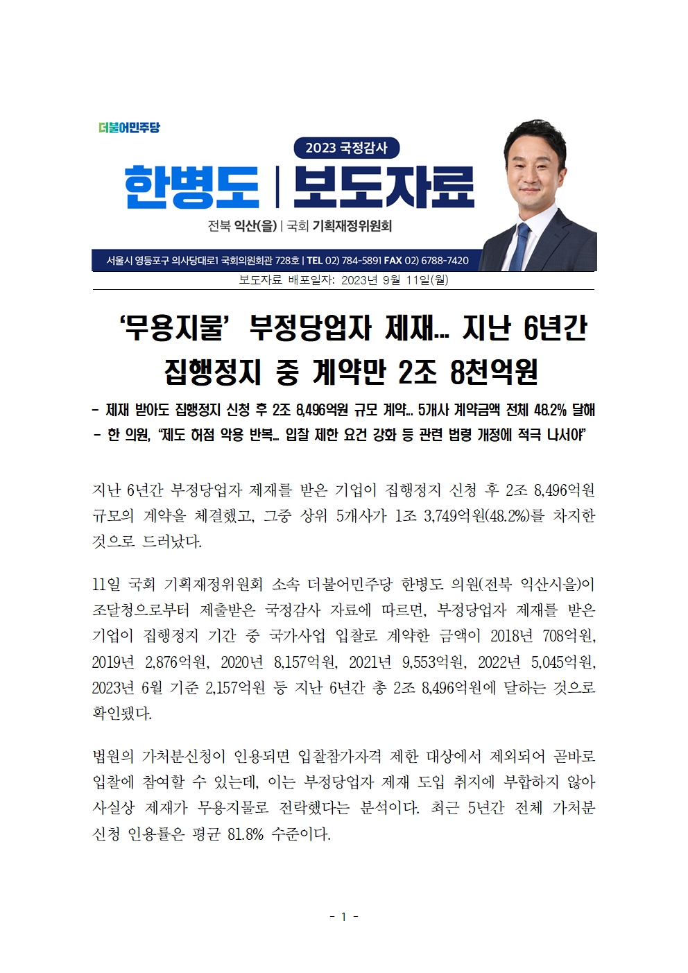 [한병도의원]2023기재위국정감사보도자료(8)_‘무용지물’ 부정당업자 제재... 지난 6년간 집행정지 중 계약만 2조 8천억원.hwp