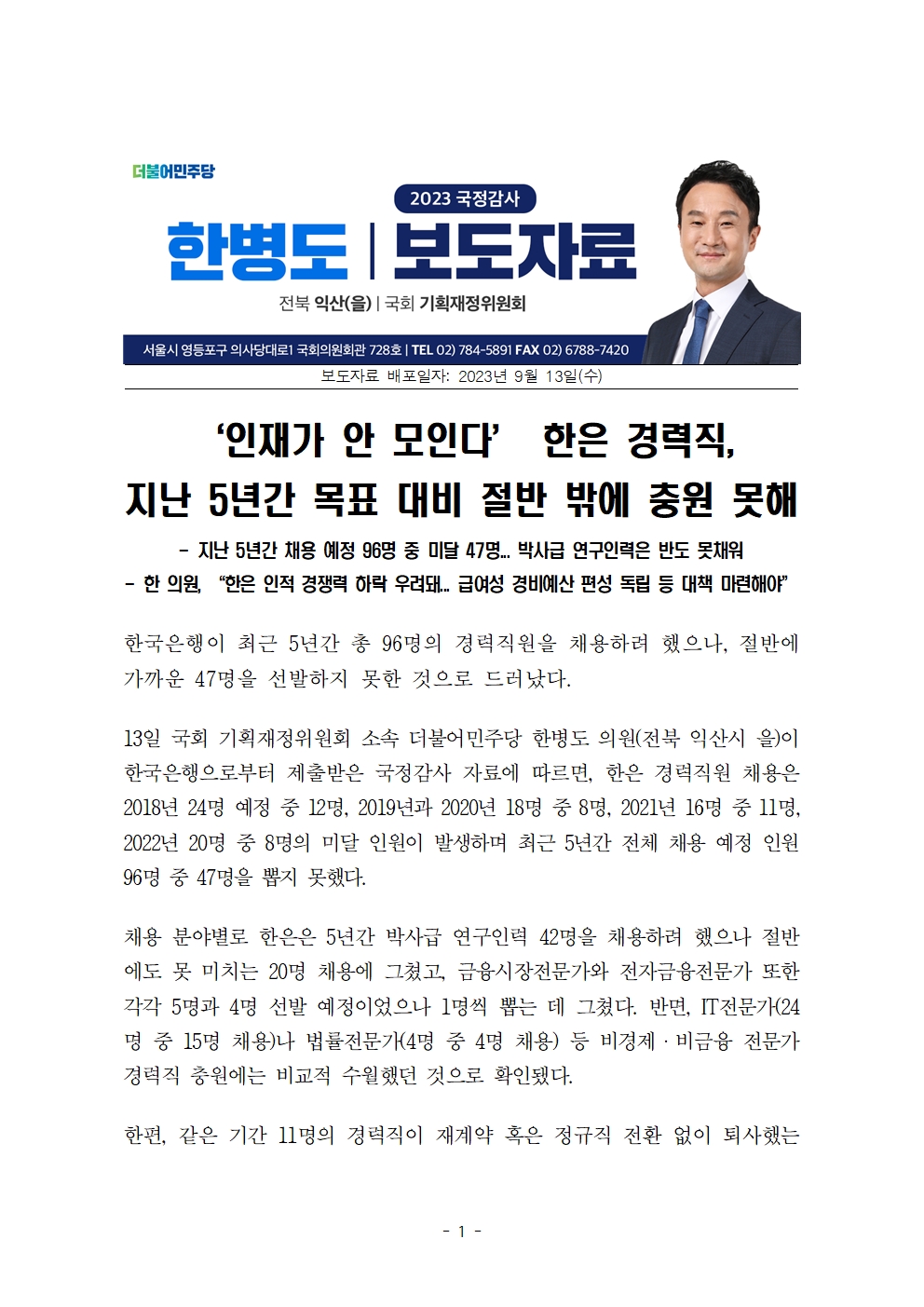 [한병도의원]2023기재위국정감사보도자료(10)_‘인재가 안 모인다’ 한은 경력직 지난 5년간 목표 대비 절반 밖에 충원 못해.hwp