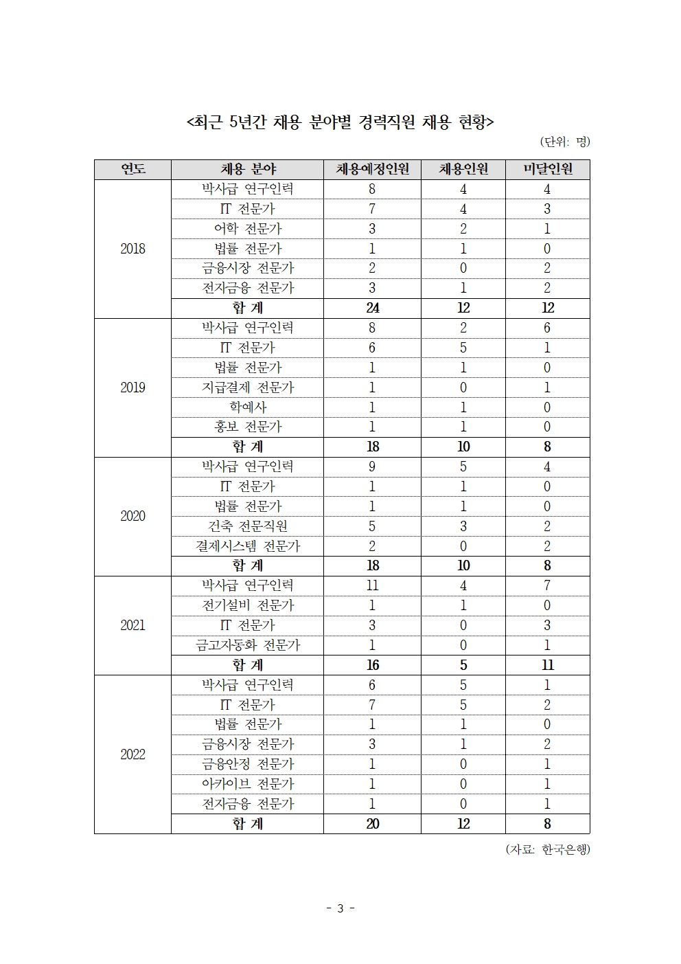 [국회의원 한병도 국감 보도자료] ‘인재가 안 모인다’ 한은 경력직, 지난 5년간 목표 대비 절반 밖에 충원 못해