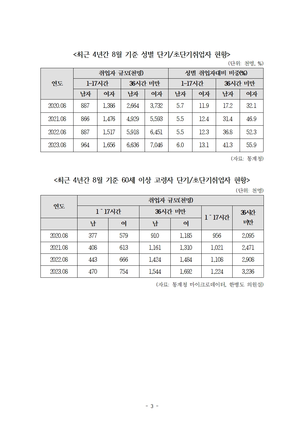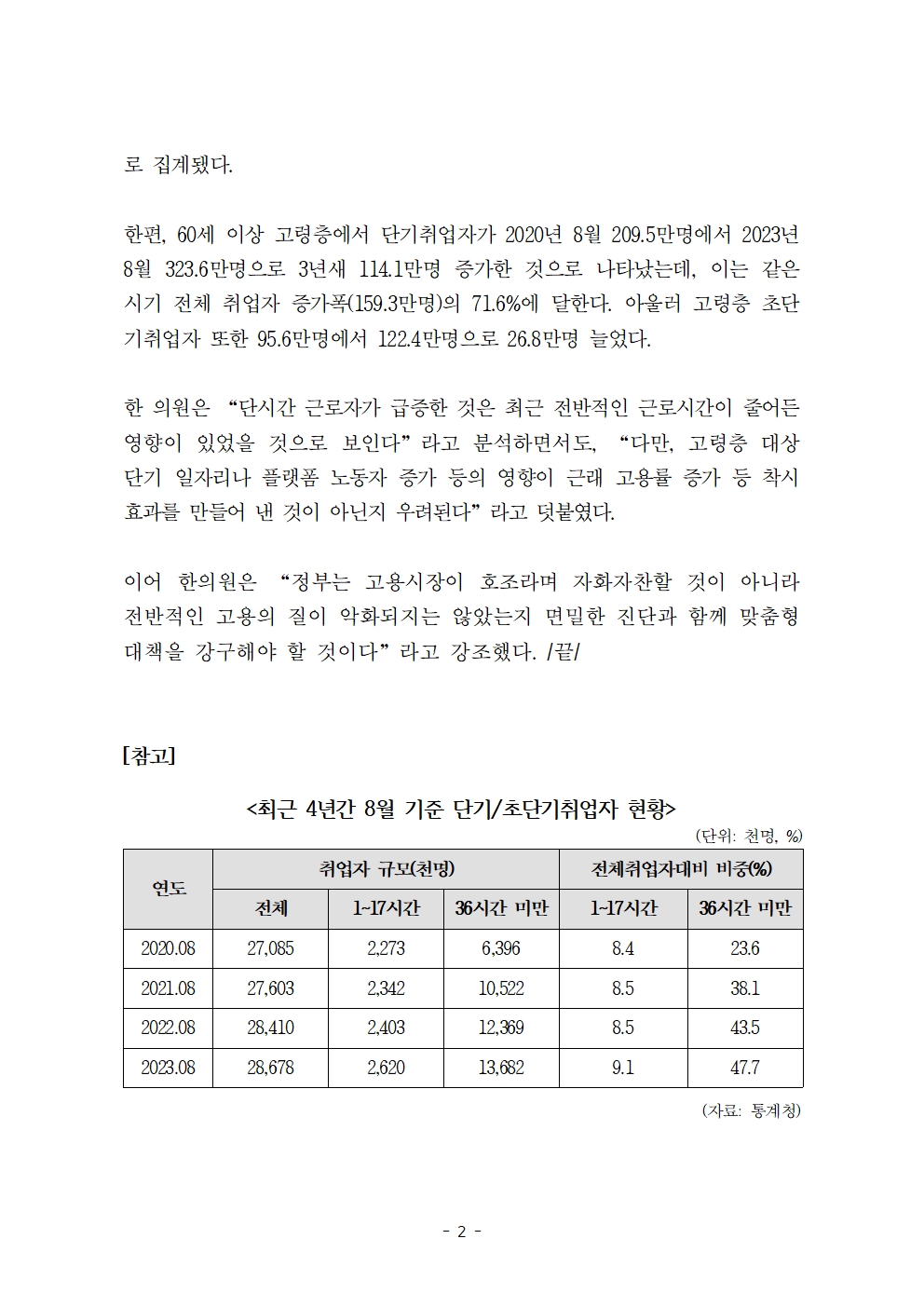 [한병도의원]2023기재위국정감사보도자료(16)_취업자 2명 중 1명은 단기취업자... 고용 호조 속 일자리 질 악화 우려.hwp