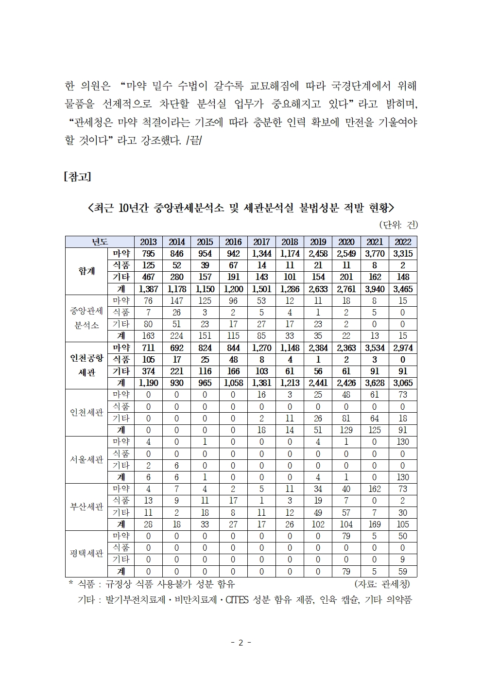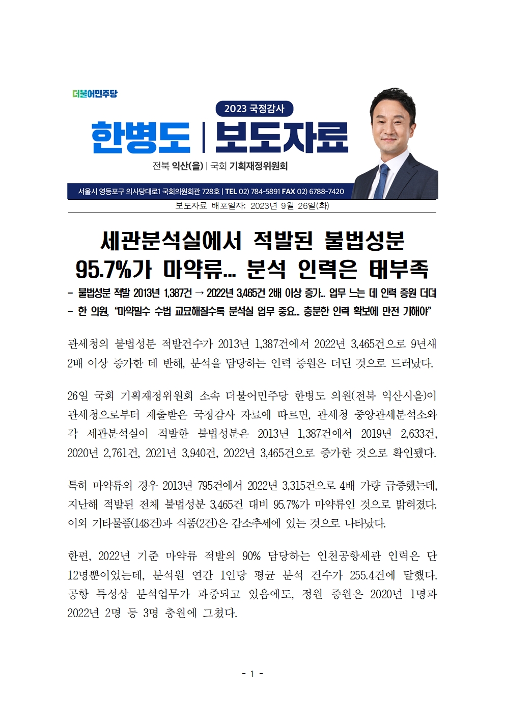 [한병도의원]2023기재위국정감사보도자료(19)_세관분석실에서 적발된 불법성분 95.7퍼센트가 마약류... 분석 인력은 태부족.hwp