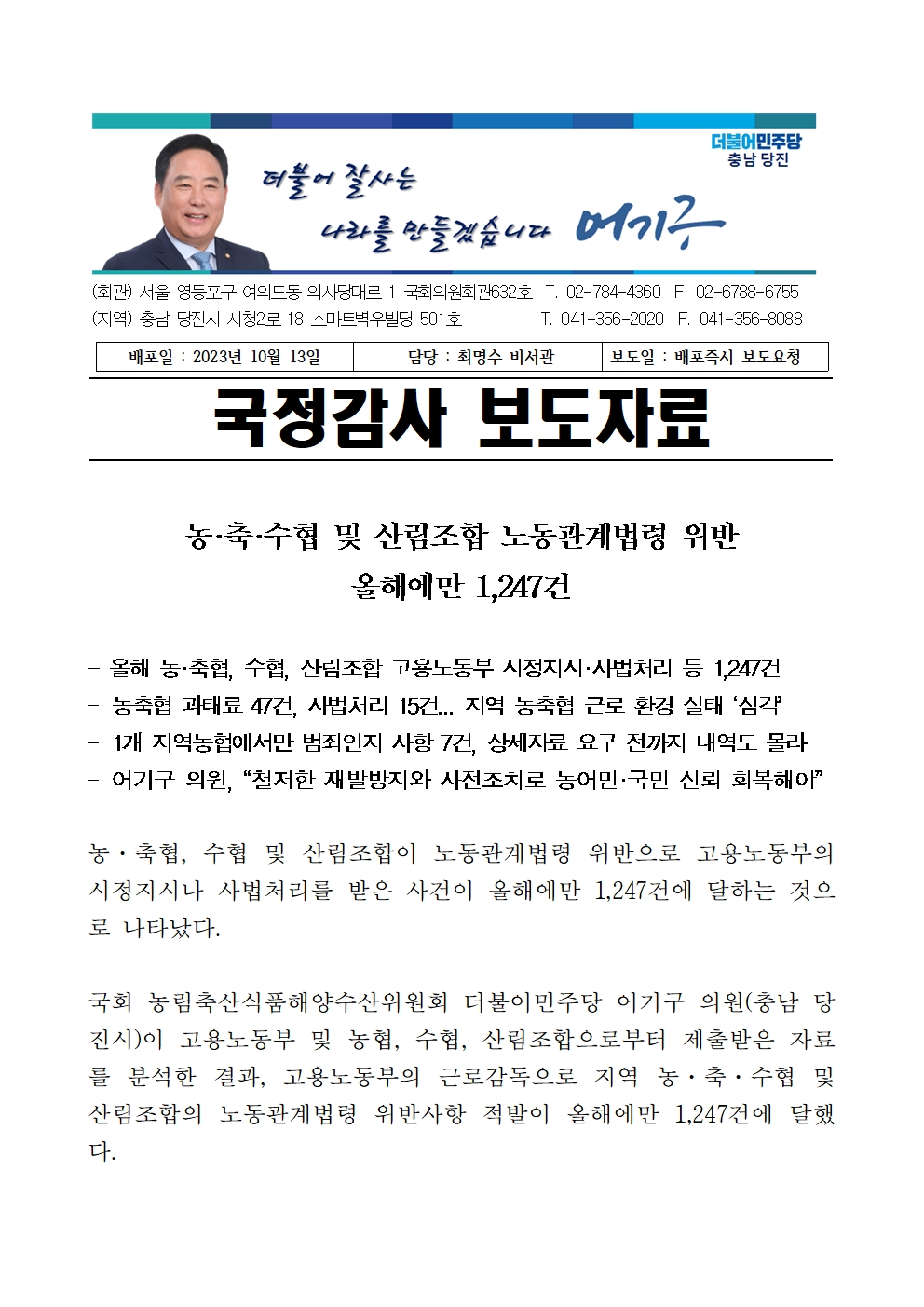 231013 [어기구의원 국정감사 보도자료] 농·축·수협 및 산림조합 노동관계법령 위반 올해에만 1247건.hwp