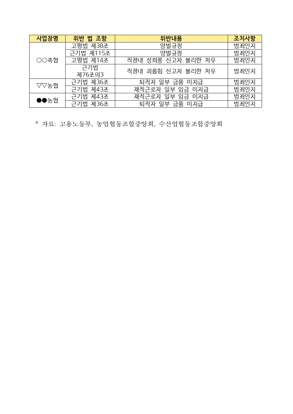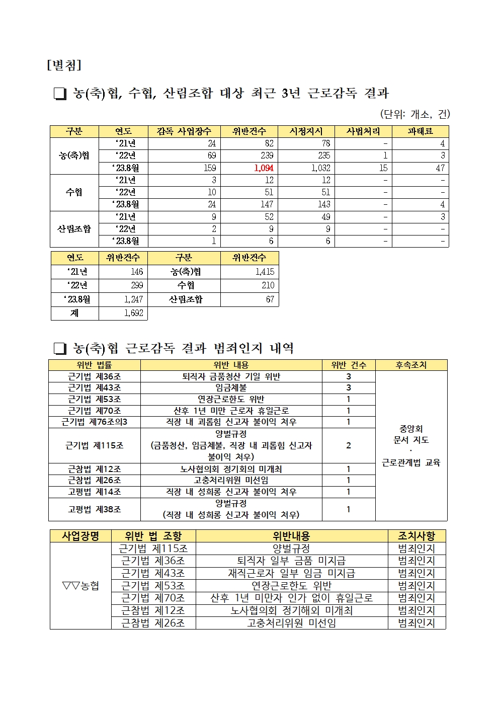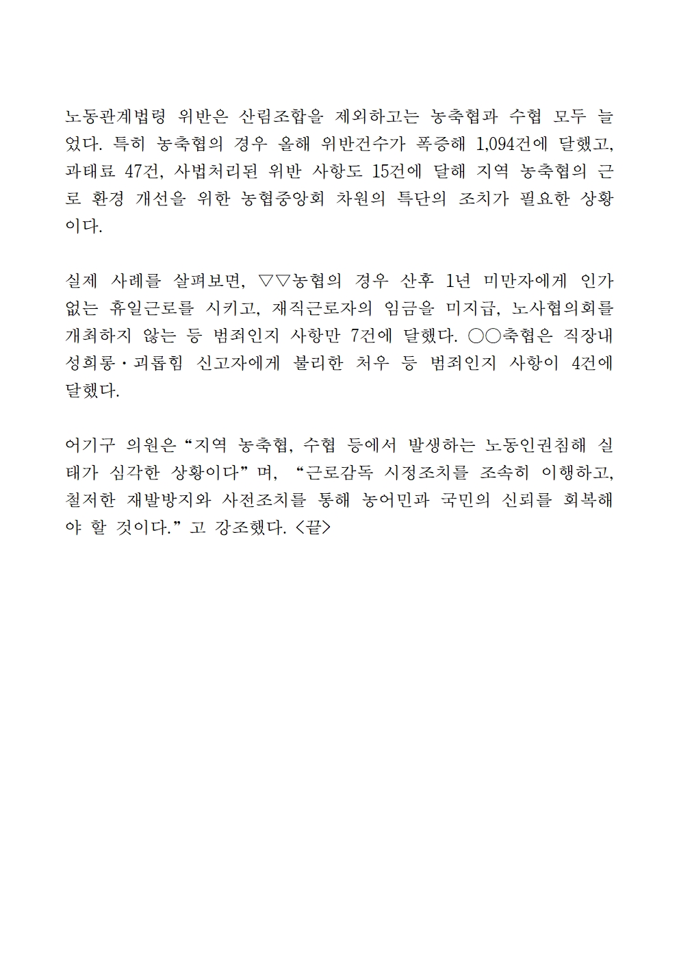 [어기구의원 국정감사 보도자료] 농·축·수협 및 산림조합 노동관계법령 위반 올해에만 1,247건