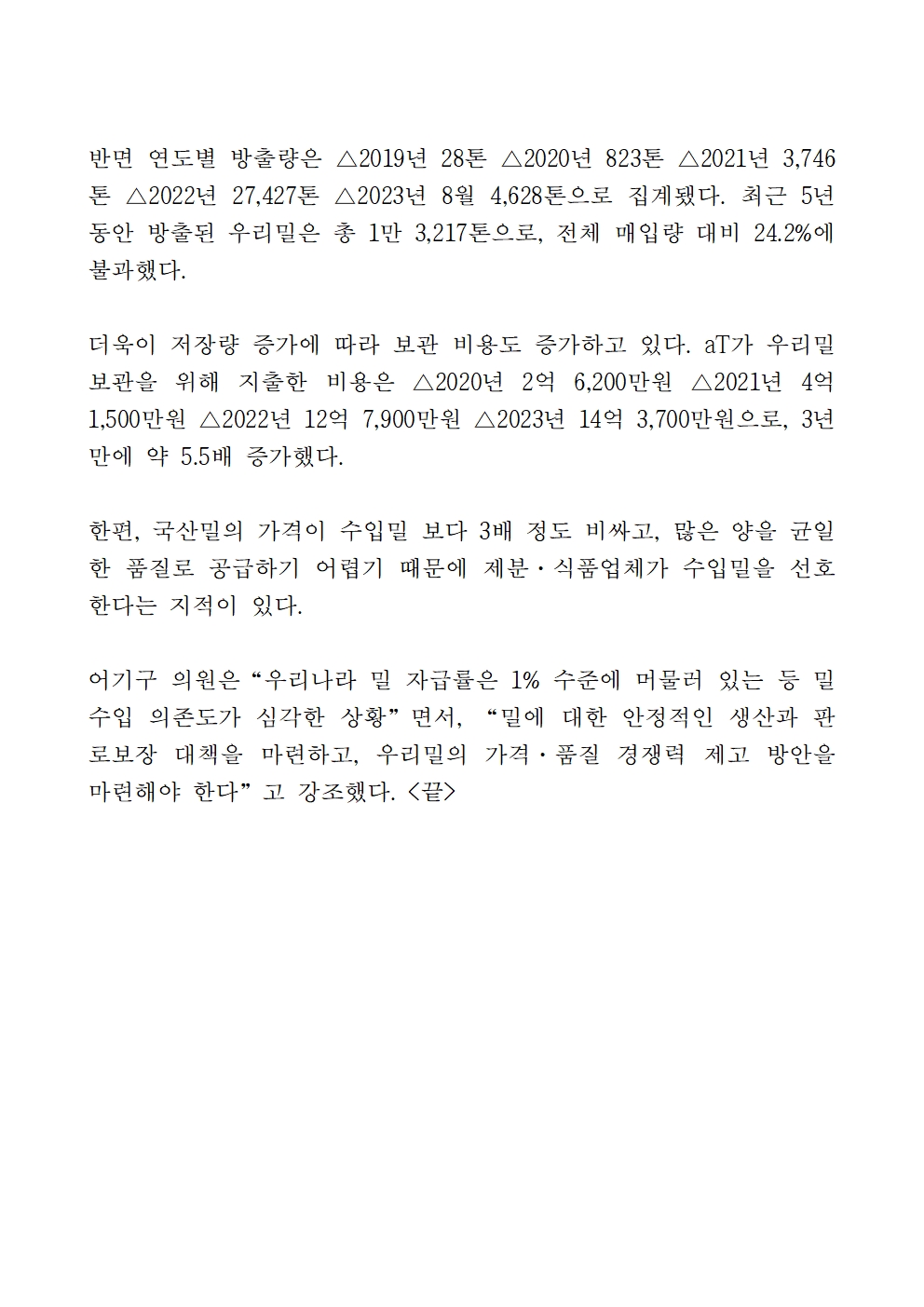 [어기구의원 국정감사 보도자료] 수요없는 우리밀, 보관 비용만 34여억원
