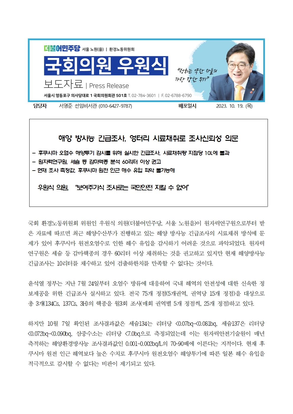 231019_우원식보도자료_해양방사능_긴급조사_엉터리시료채취로_조사신뢰성_의문.hwp