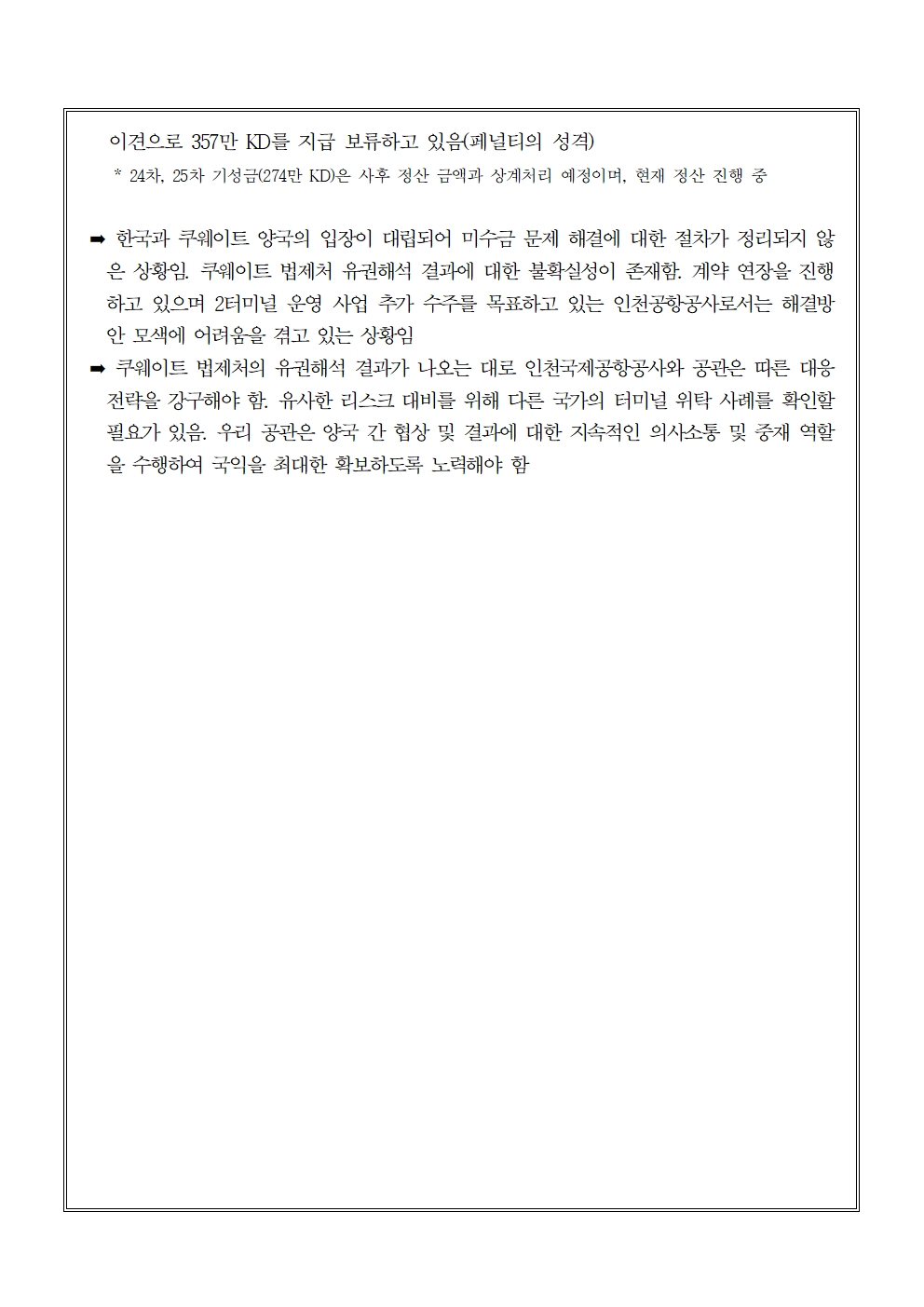 [전해철의원 국정감사 보도자료] 쿠웨이트공항 제4터미널 위탁 운영 사업 미수금 관련