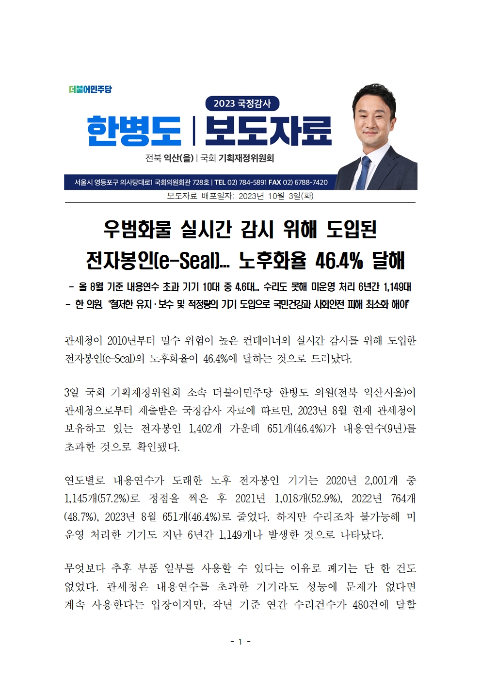 [한병도의원]2023기재위국정감사보도자료(22)_우범화물 실시간 감시 위해 도입된 전자봉인(e-Seal)... 노후화율 46.4퍼센트 달해.hwp