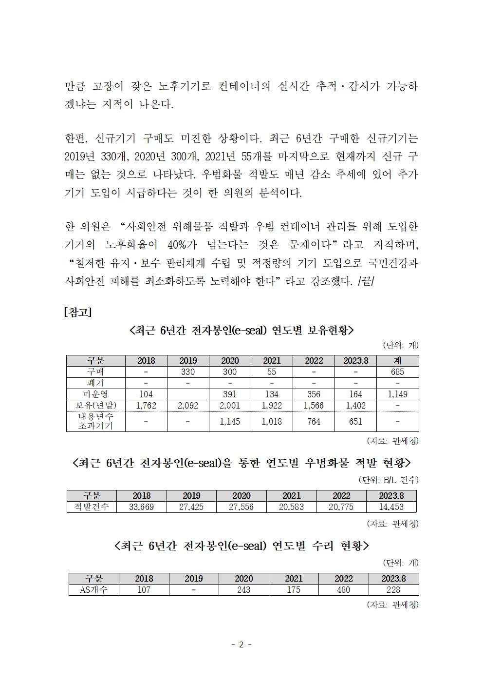 [국회의원 한병도 국감 보도자료] 우범화물 실시간 감시 위해 도입된 전자봉인(e-Seal)... 노후화율 46.4퍼센트 달해