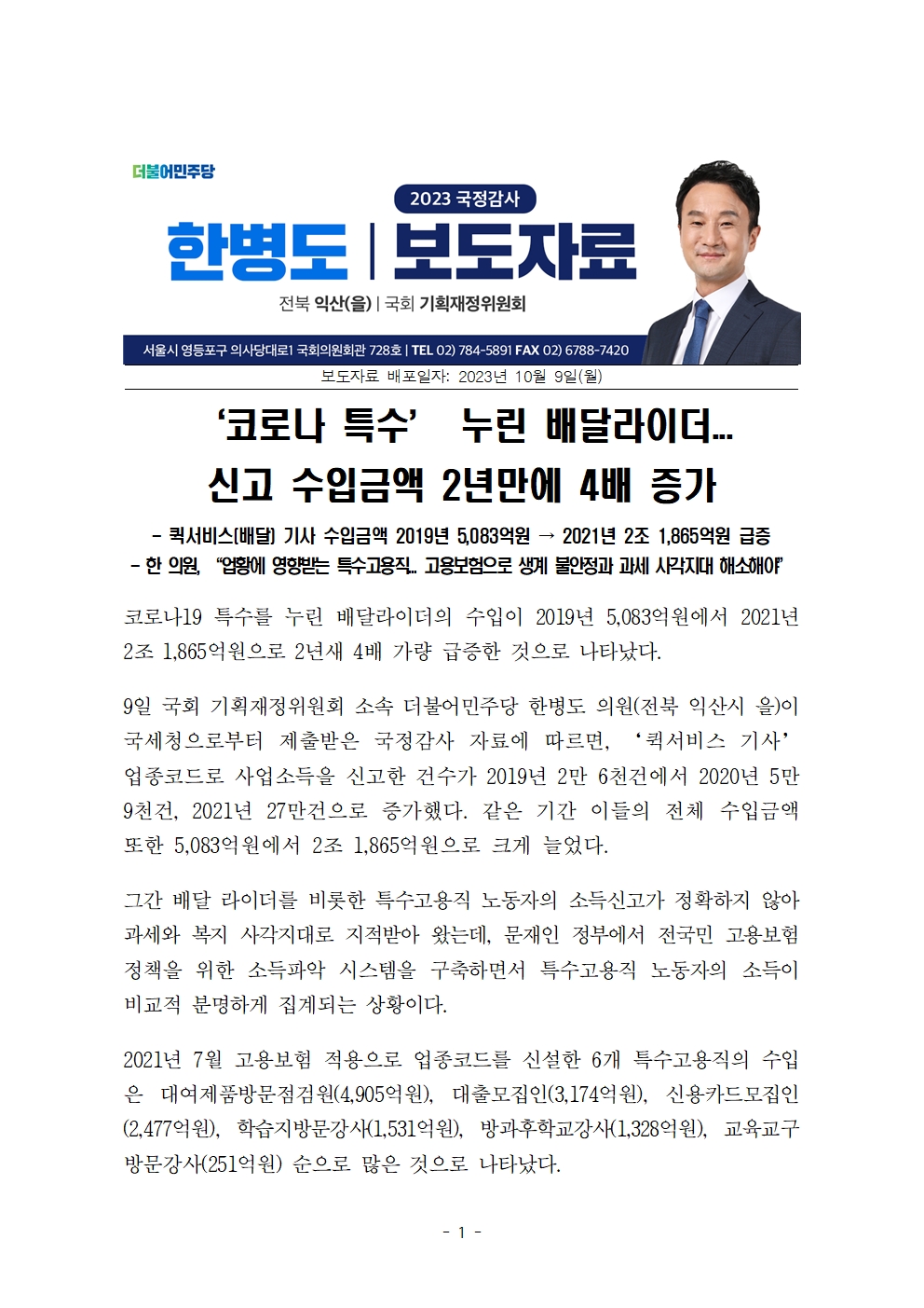 [국회의원 한병도 국감 보도자료] ‘코로나 특수’ 누린 배달라이더... 신고 수입금액 2년만에 4배 증가