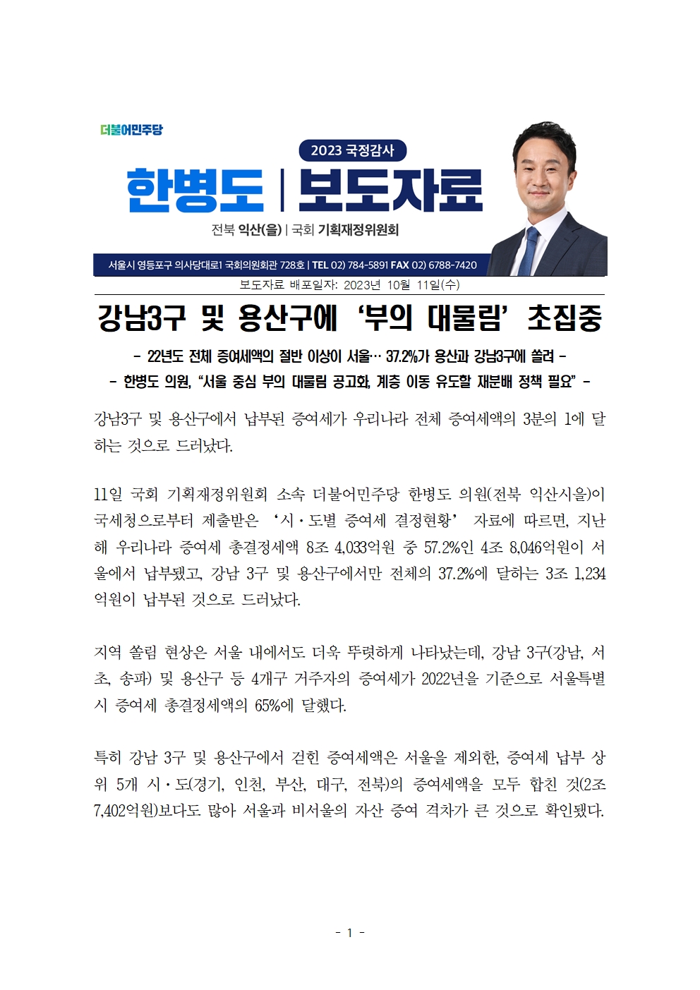 [국회의원 한병도 국감 보도자료] 강남 3구 및 용산구에 ‘부의 대물림’ 초집중
