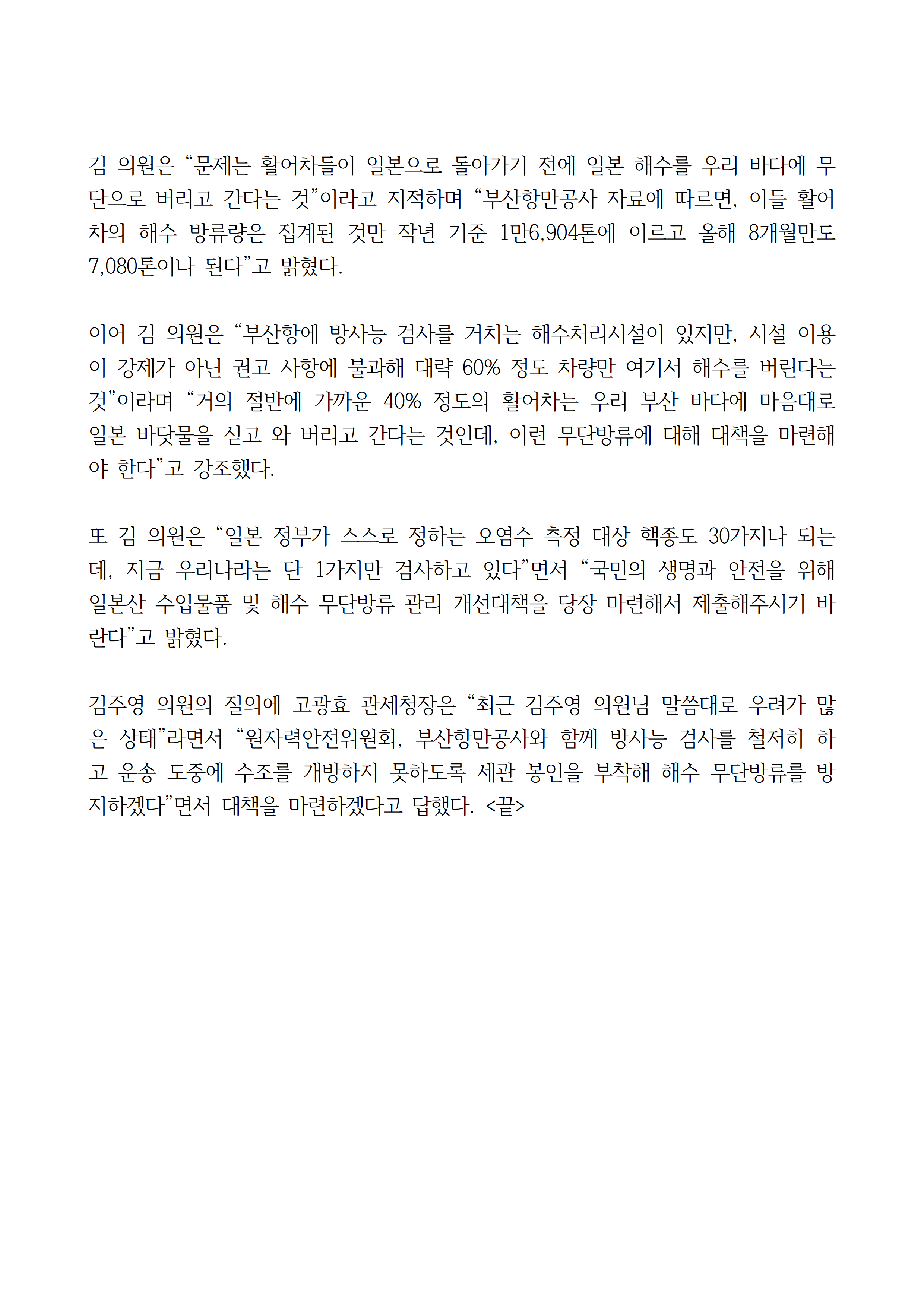 231012_국감보도자료_김주영_의원_후쿠시마서_온_활어차_우리바다에_무방비로_일본해수_방류한다_질의.hwp