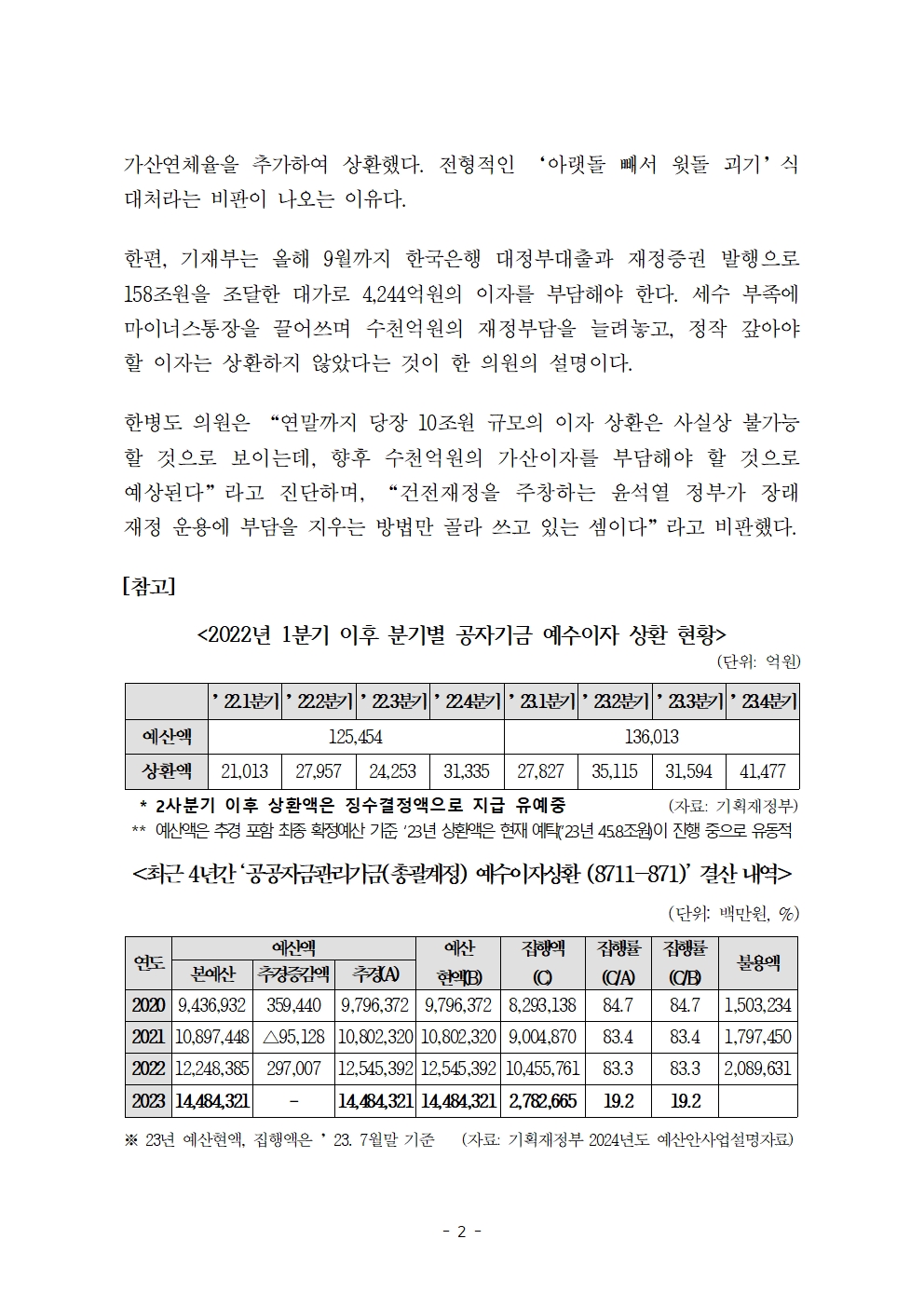 [한병도의원]2023기재위국정감사보도자료(34)_세수펑크에 아랫돌 빼서 윗돌 괴기 반복... 기재부 공자기금 이자상환도 유예.hwp