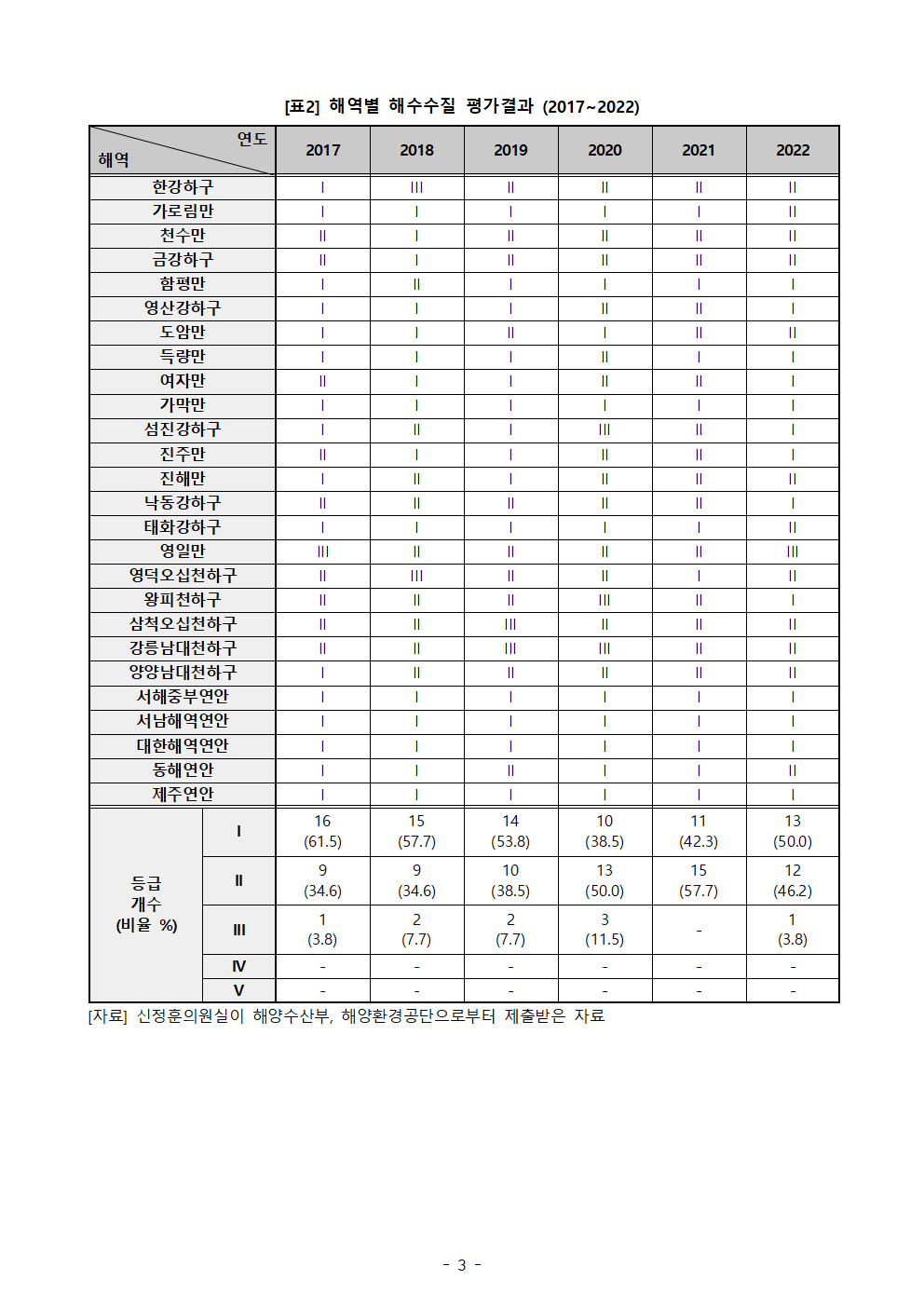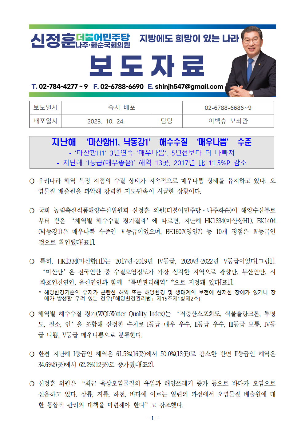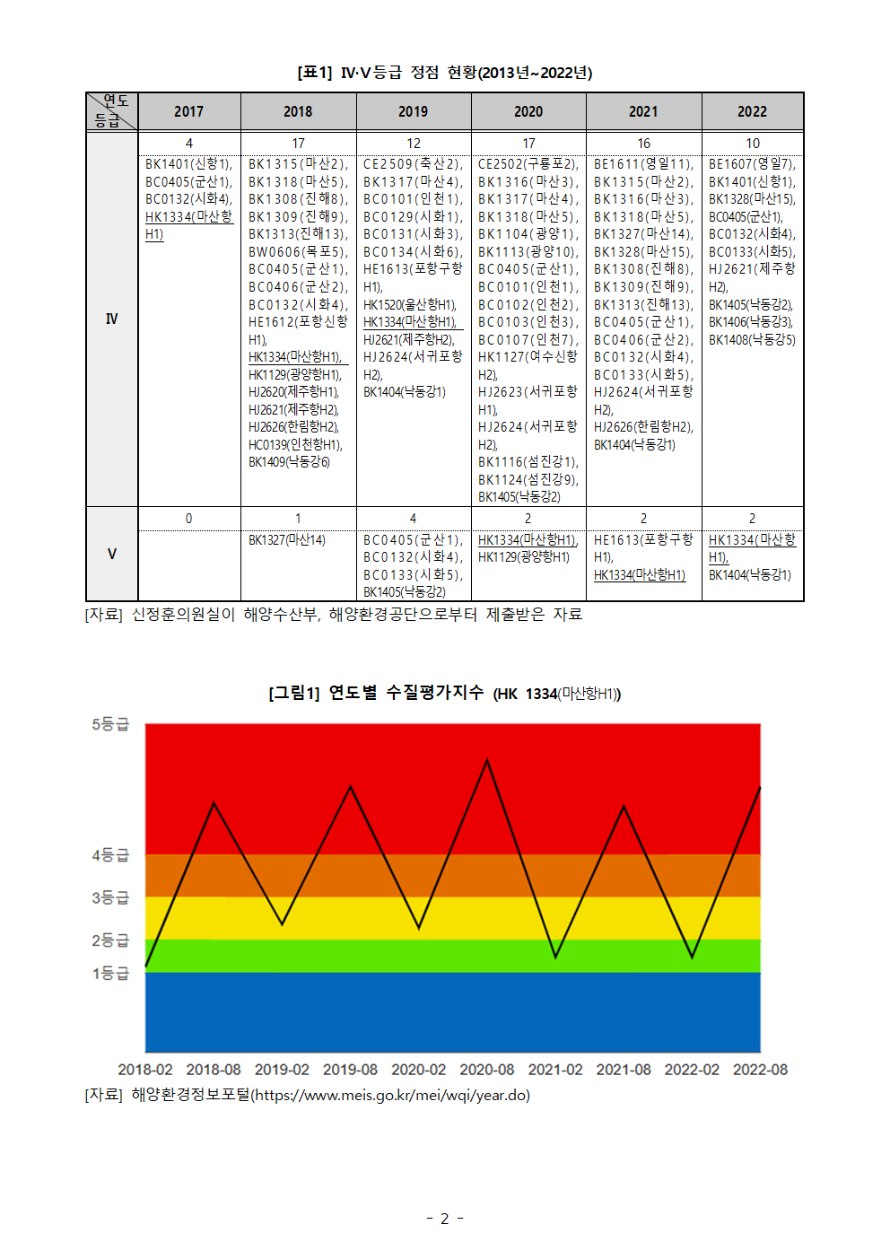 [신정훈 의원 보도자료] 지난해 ‘마산항H1, 낙동강1’ 해수수질 ‘매우나쁨’ 수준