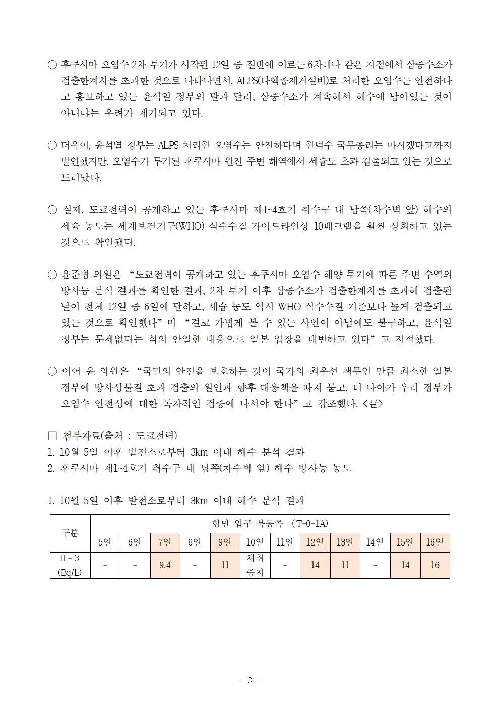 231020 [윤준병 의원 국정감사 보도자료] 윤준병 의원 “2차 투기 이후 삼중수소 검출한계치 초과 6차례!”.hwp