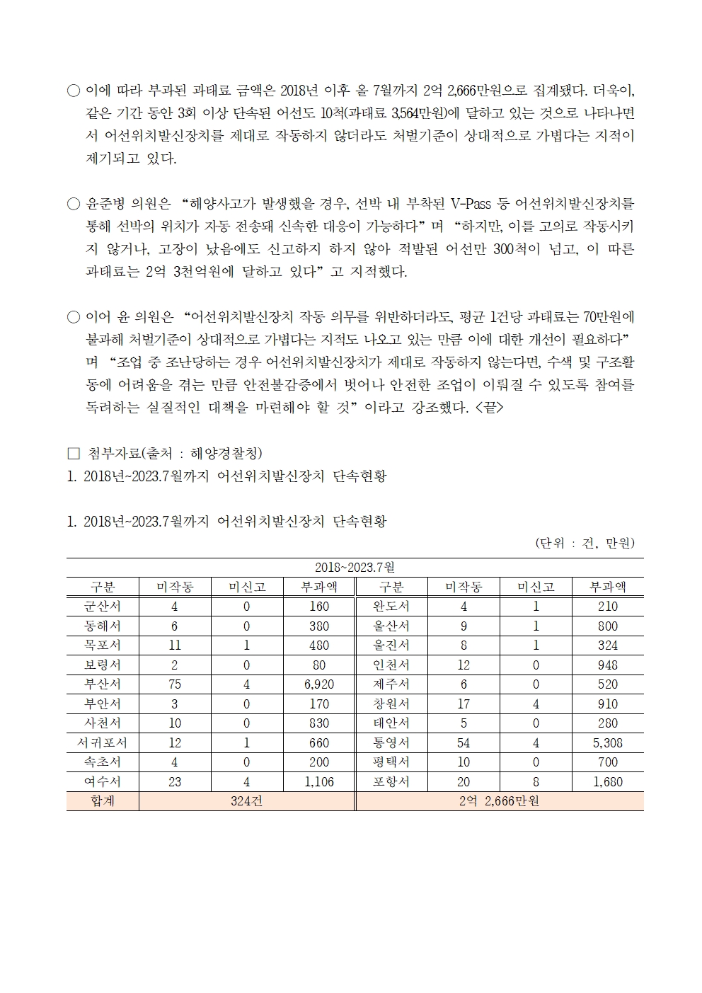 231020 [윤준병 의원 국정감사 보도자료] 윤준병 의원 어선위치발신장치 미작동·미신고 적발 5년간 324건.hwp