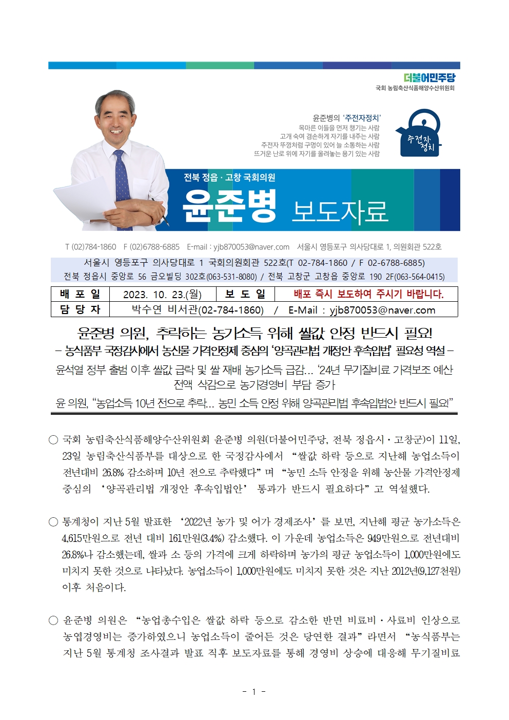 231023 [윤준병 의원 국정감사 보도자료] 윤준병 의원_ 추락하는 농가소득 위해 쌀값 안정 반드시 필요!.hwp