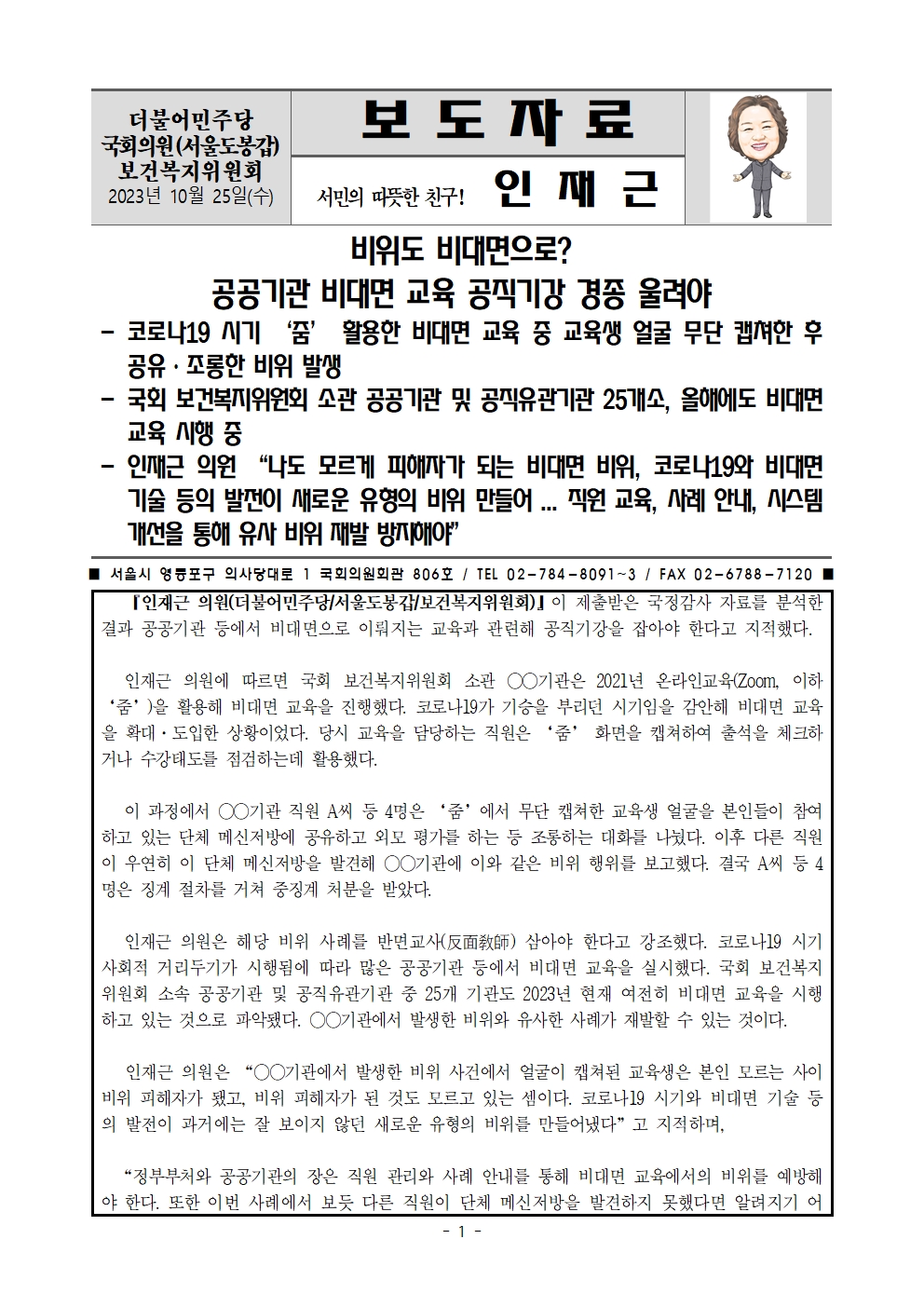 231025_[인재근의원실 보도자료] 비위도 비대면으로_ 공공기관 비대면 교육 공직기강 경종 울려야.hwp