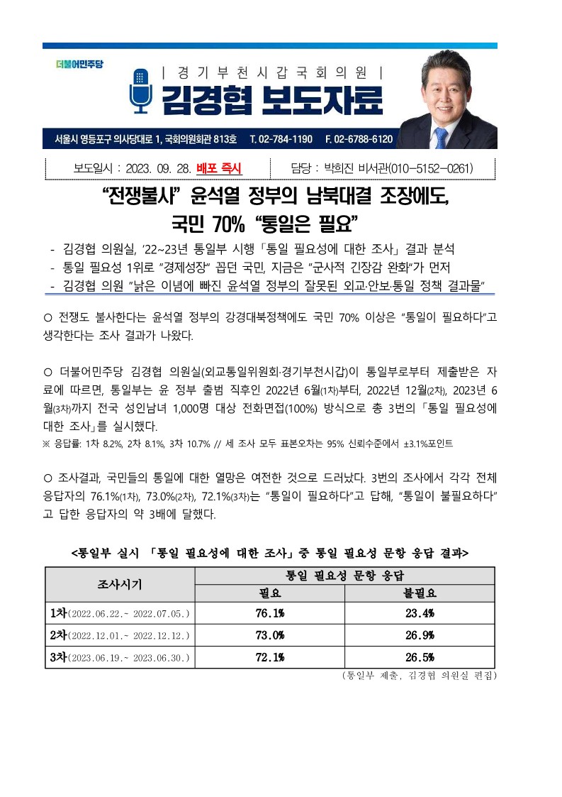 [국회의원 김경협 국정감사 보도자료] “전쟁불사”윤석열 정부의 남북대결 조장에도, 국민 70%“통일은 필요”