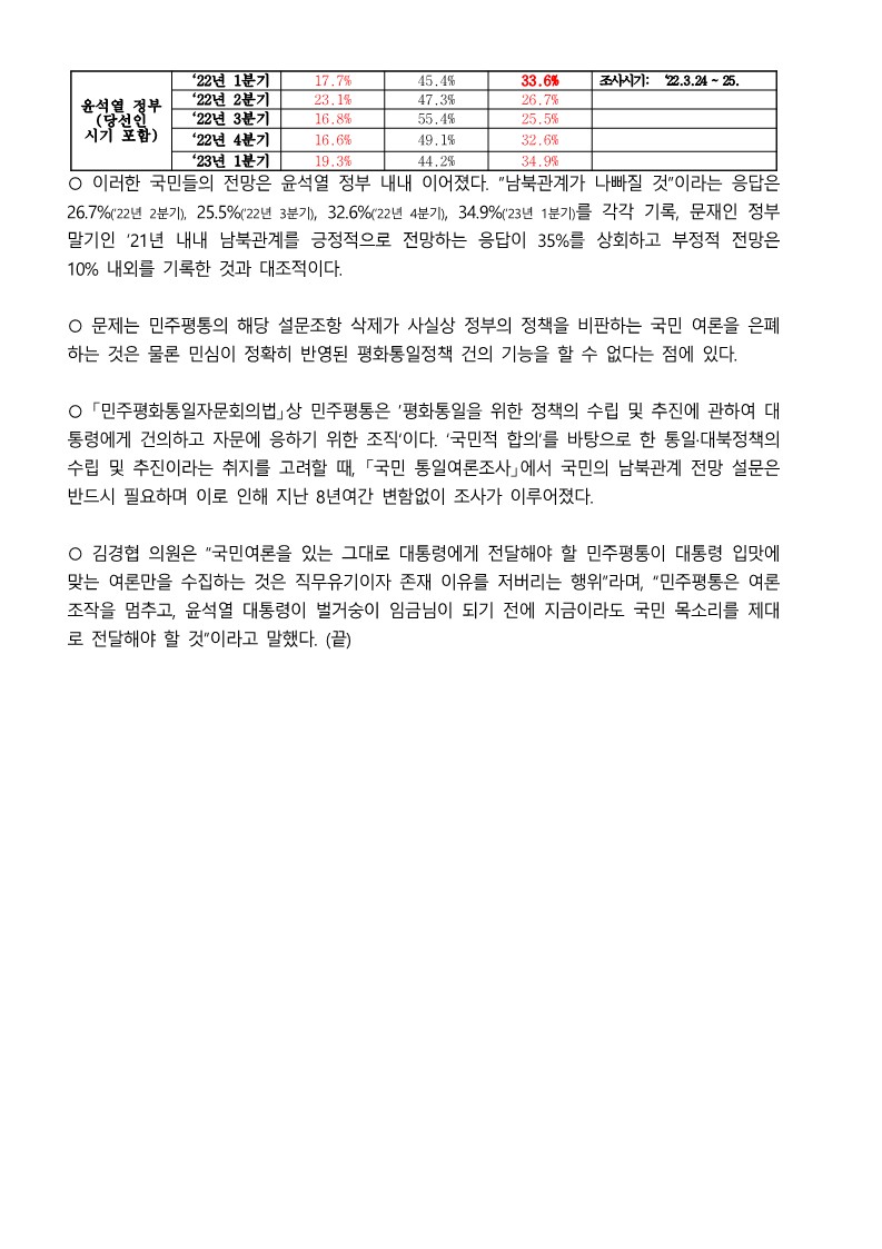 [국회의원 김경협 국정감사 보도자료] ‘남북관계 나빠질 것’국민 전망 급증하자 ‘남북관계 전망’설문 삭제한 윤정부 민주평통.hwp