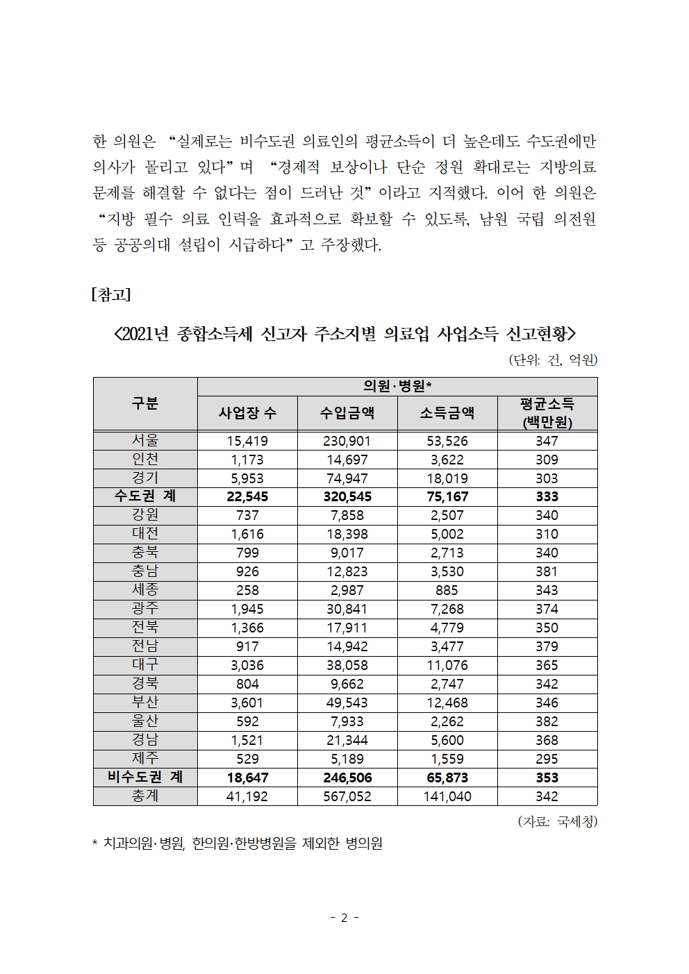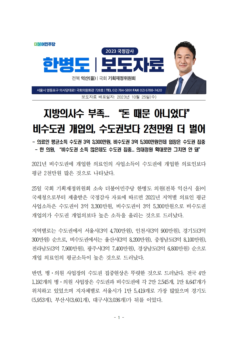 [한병도의원]2023기재위국정감사보도자료(38)_지방의사수 부족... “돈 때문 아니었다” 비수도권 개업의 수도권보다 2천만원 더 벌어.hwp