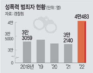 21일 경찰청이 오영환 더불어민주당 의원실에 제출한 자료에 따르면 지난해 성폭력(강간·강제추행, 카메라 등 이용촬영, 통신매체 이용 음란, 성적 목적 다중이용장소 침입 등) 범죄자는 4만483명을 기록했다. 경찰에 따르면 성폭력 범죄자가 4만 명을 넘긴 것은 통계 작성 이래 지난해가 처음이다. 성폭력 범죄자 수는 지난 2021년 3만2140명을 기록하는 등 3만 명 초반대를 유지해왔다.