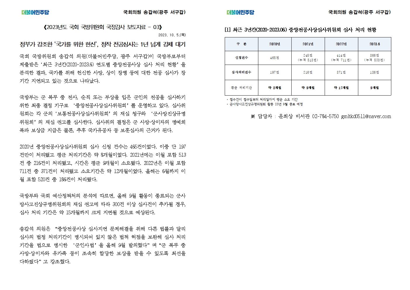 231005-(국감보도3★)정부가 강조한 ‘국가를 위한 헌신’ 정작 심사까지 1년 넘게 강제 대기.hwp