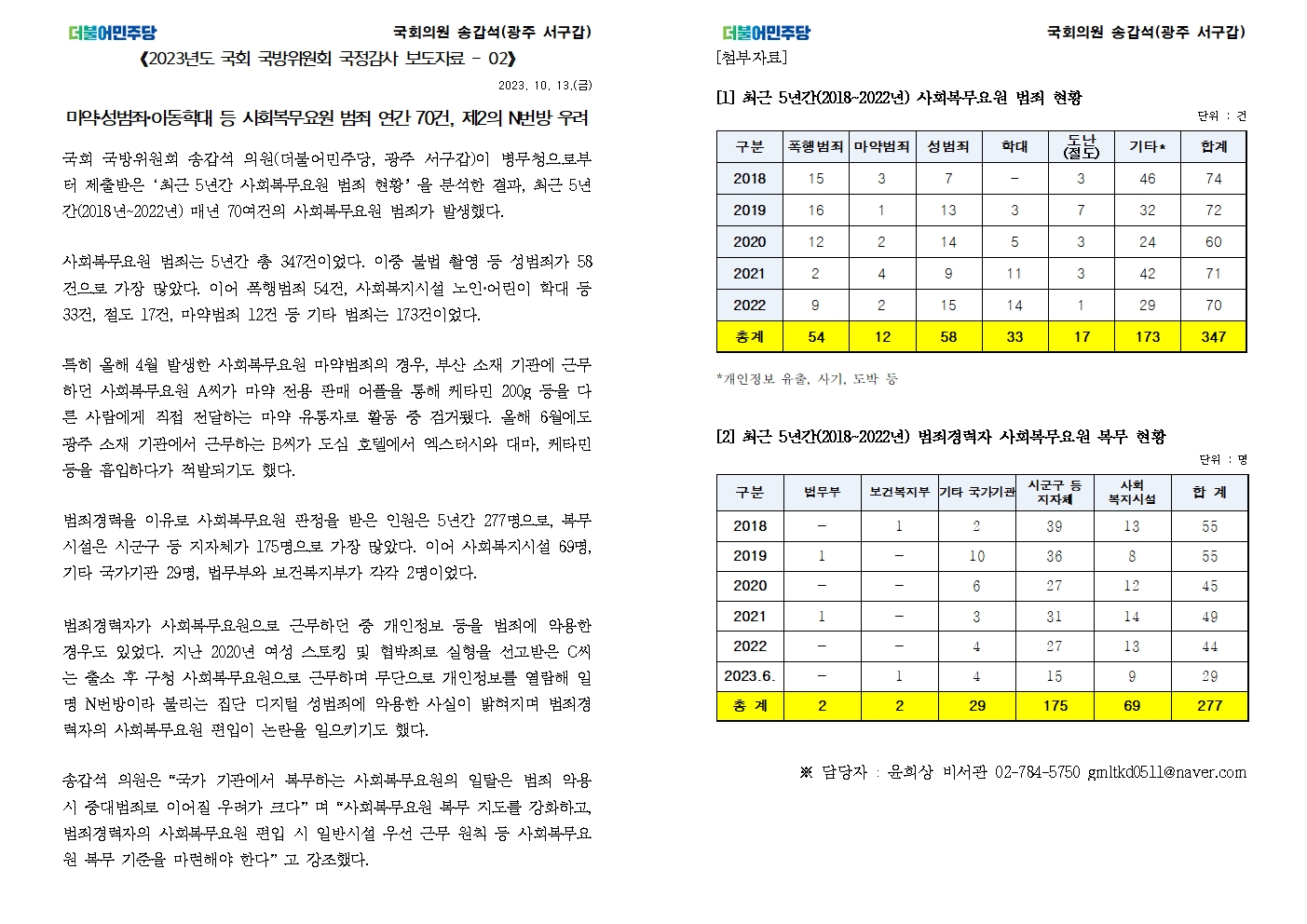 [국회의원 송갑석 국정감사 보도자료] 마약,성범죄,아동학대 등 사회복무요원 범죄 연간 70건, 제2의 N번방 우려