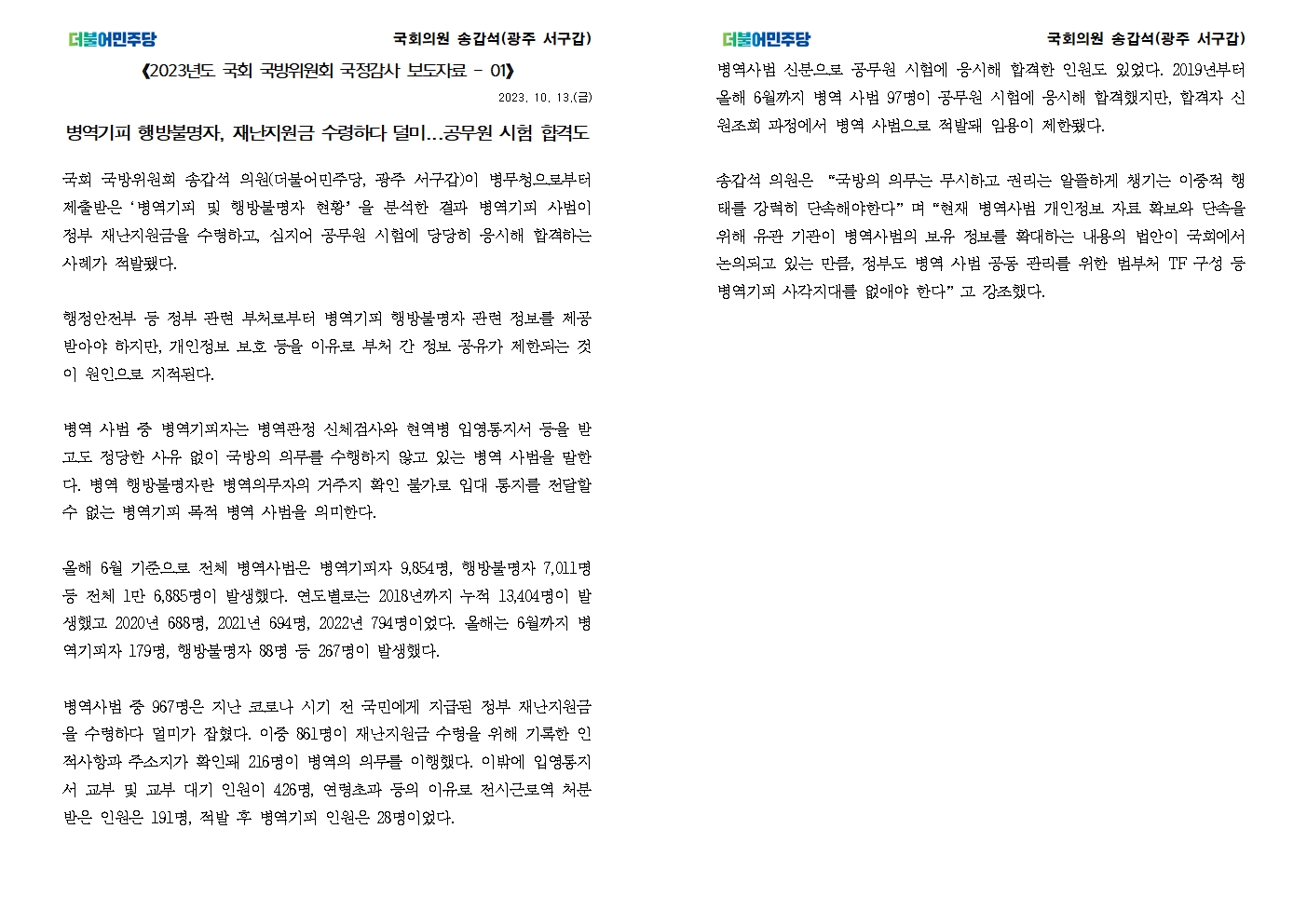 231012-(국감보도★)병역기피 행방불명자 재난지원금 수령하다 덜미...공무원 시험 합격도.hwp