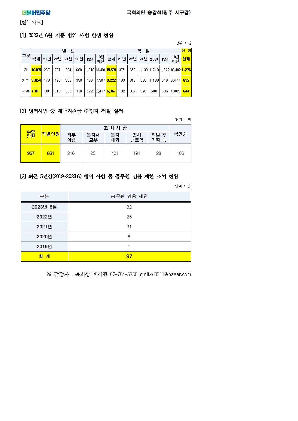 [국회의원 송갑석 국정감사 보도자료] 병역기피 행방불명자, 재난지원금 수령하다 덜미...공무원 시험 합격도