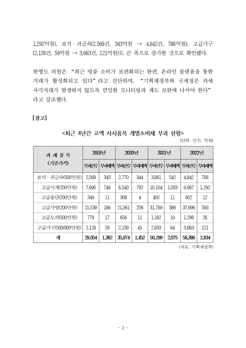 [한병도의원]2023기재위국정감사보도자료(39)_‘경제 어렵다’는데... 최근 3년새 고가 사치품 소비는 두 배 증가.hwp