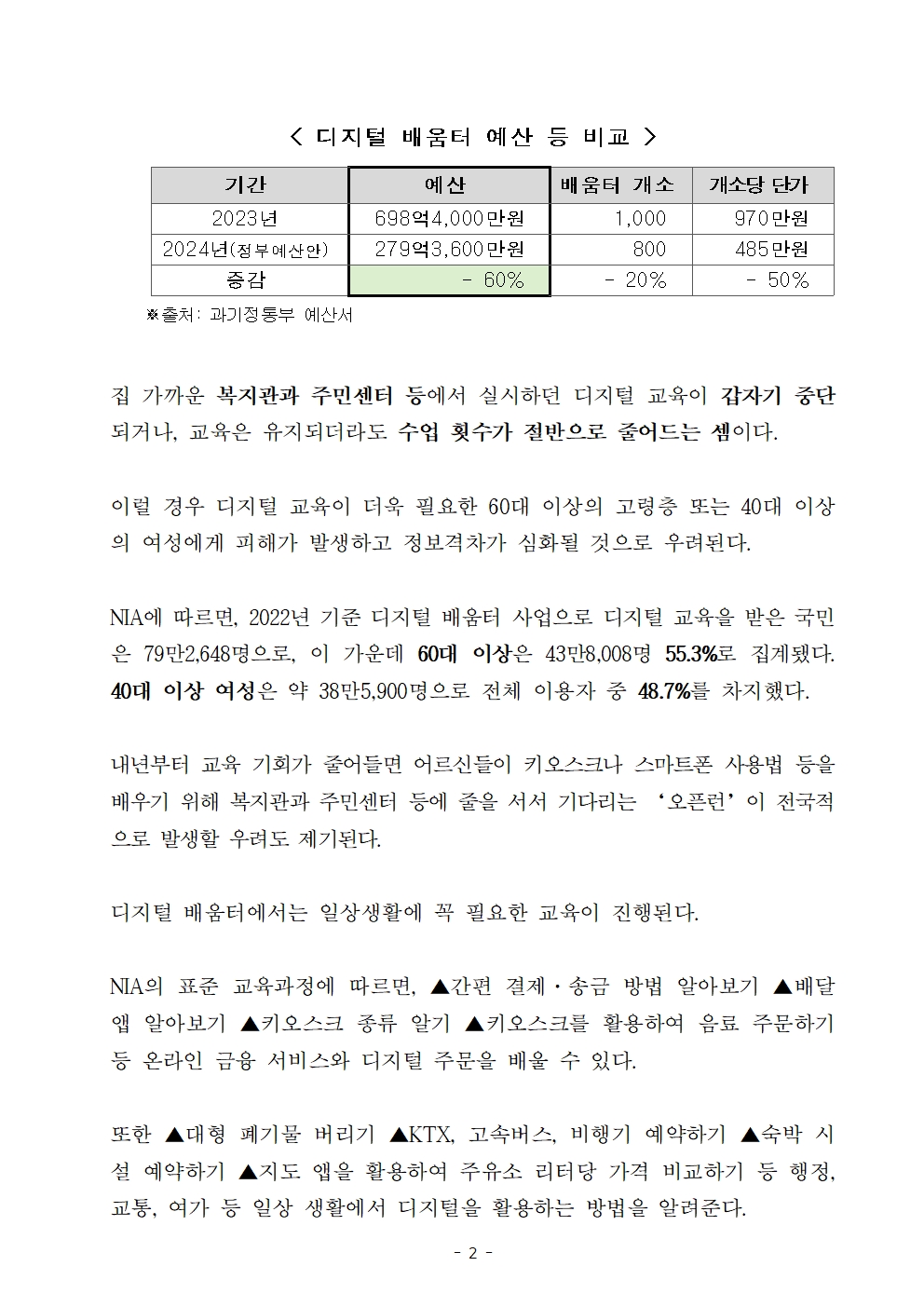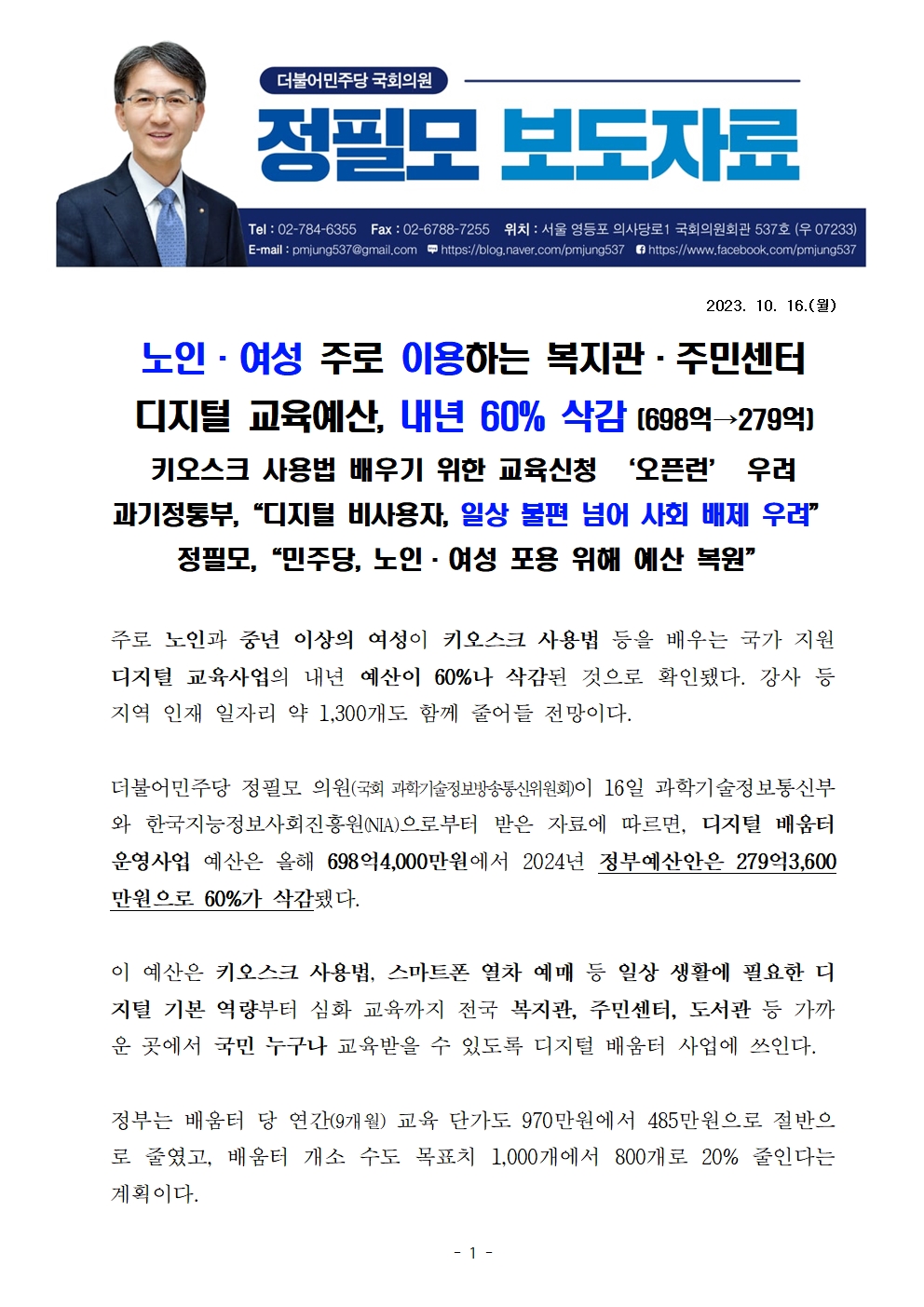 [정필모 의원 보도자료] 노인·여성 주로 이용하는 복지관·주민센터디지털 교육예산, 내년 60% 삭감