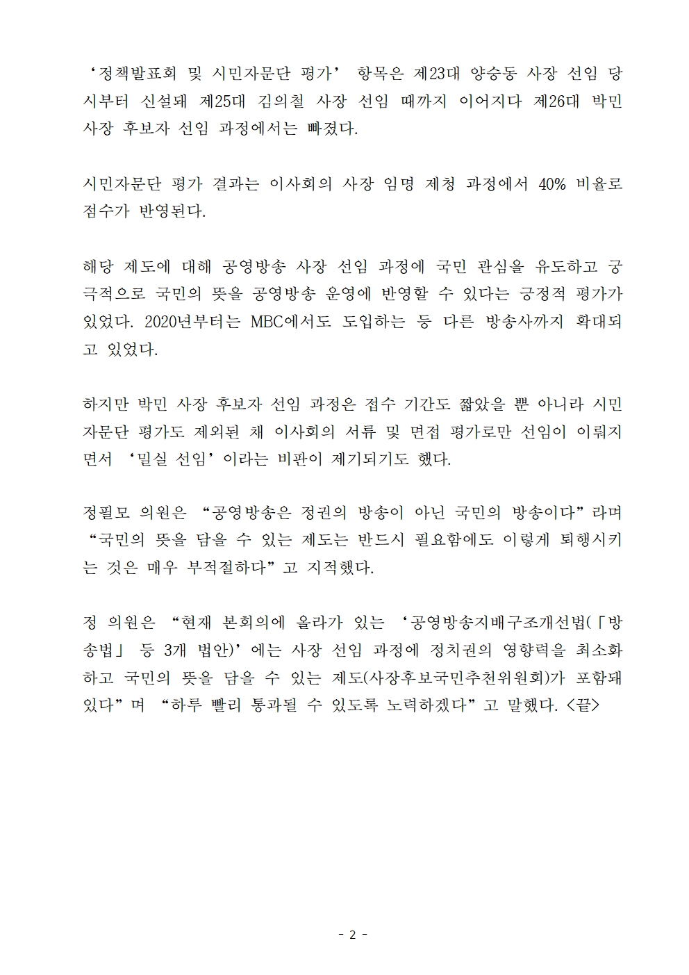 [정필모 의원 보도자료] 공영방송 KBS 사장 선임방식 퇴행