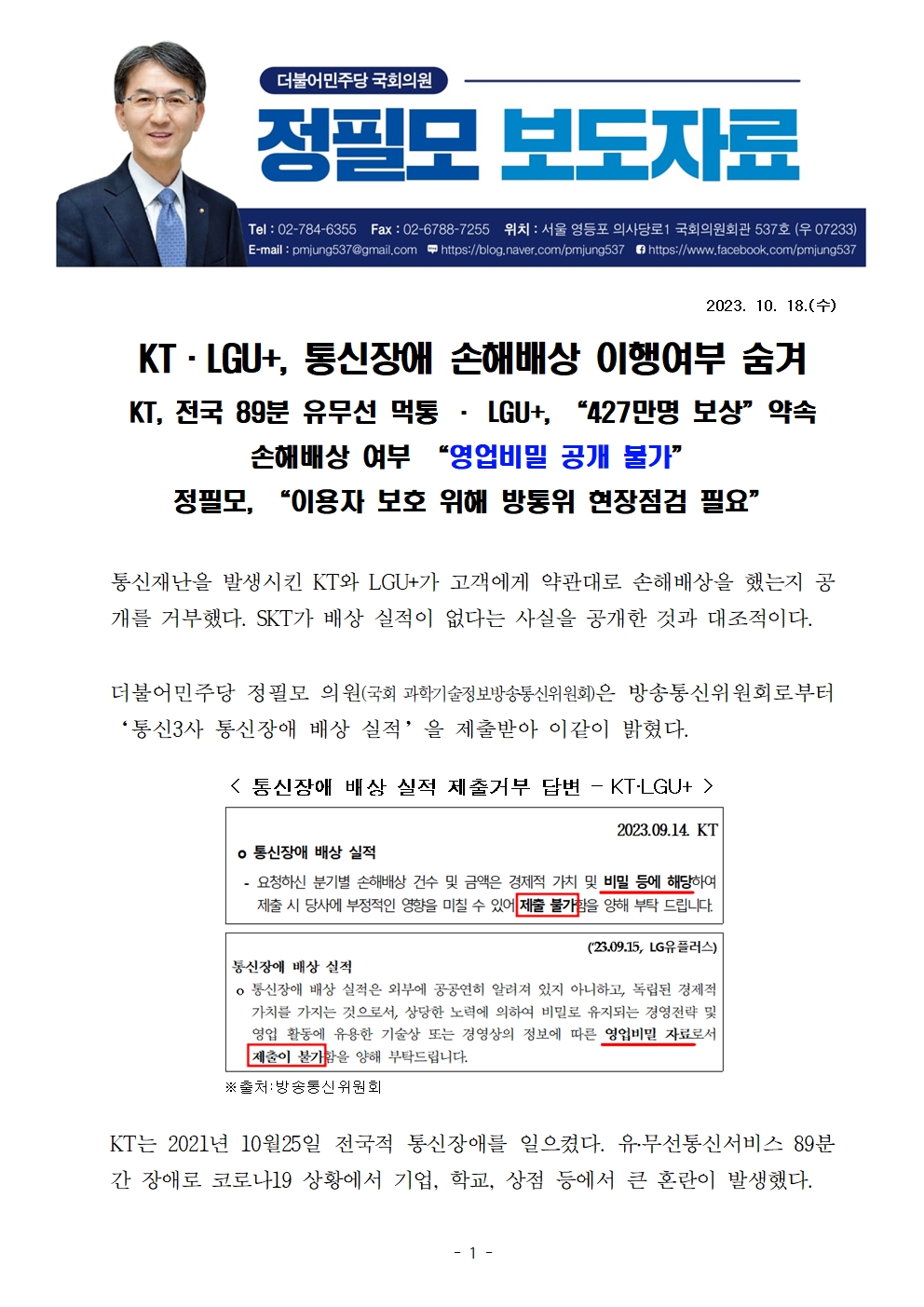 231018_국정감사_보도자료_방통위_KT·LGU+_통신장애_손해배상_이행여부_숨겨_정필모의원.hwp