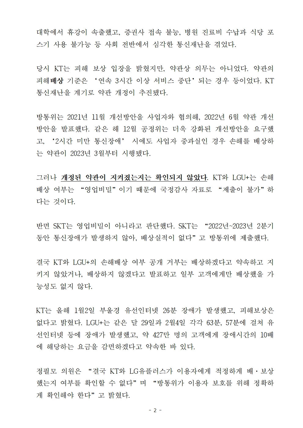 [정필모 의원 보도자료] KT·LGU+, 통신장애 손해배상 이행여부 숨겨
