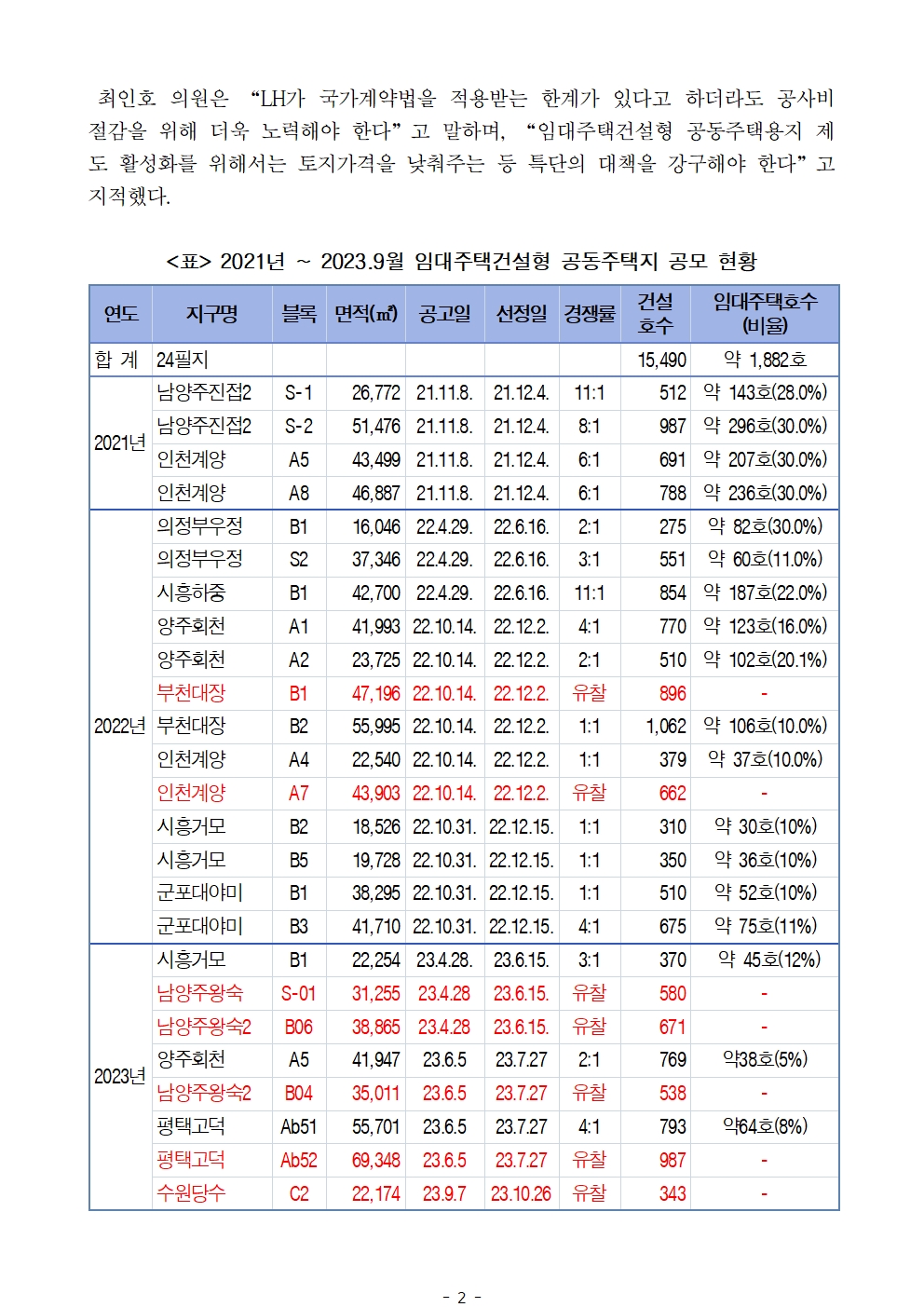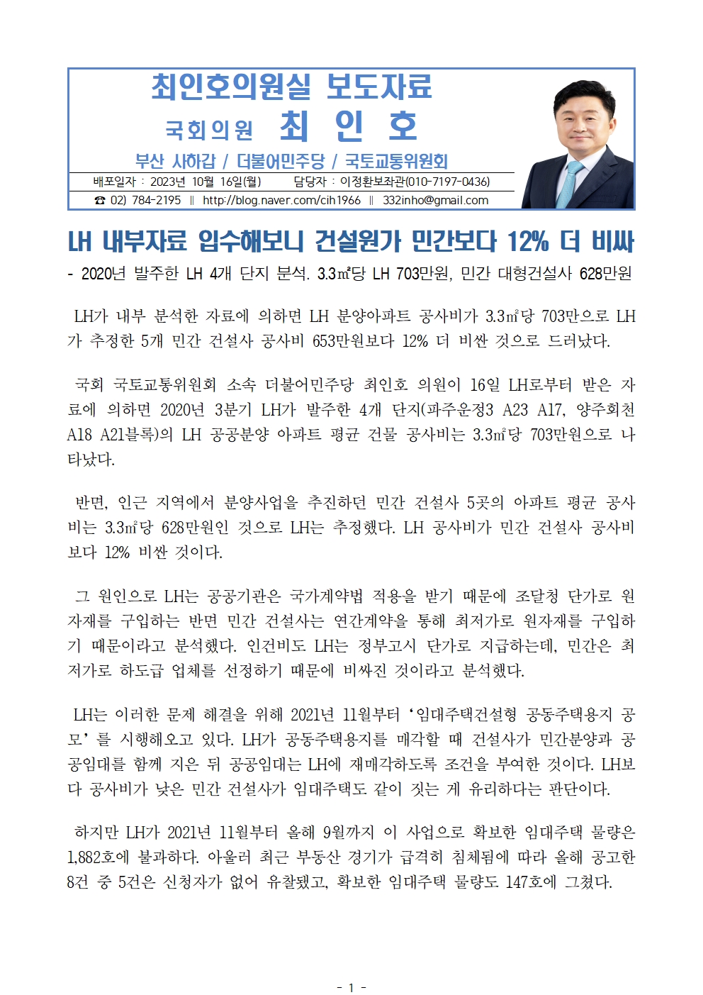 [최인호 의원 보도자료]LH 내부자료 입수해보니 건설원가 민간보다 12% 더 비싸